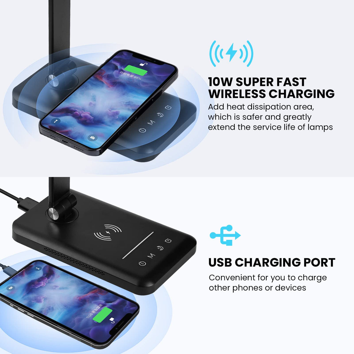 Q: Can I charge my devices using the JOSTIC LED Desk Lamp?A: Absolutely! The lamp comes with a fast wireless charger and a USB charging port, allowing you to charge your devices conveniently while using the lamp.