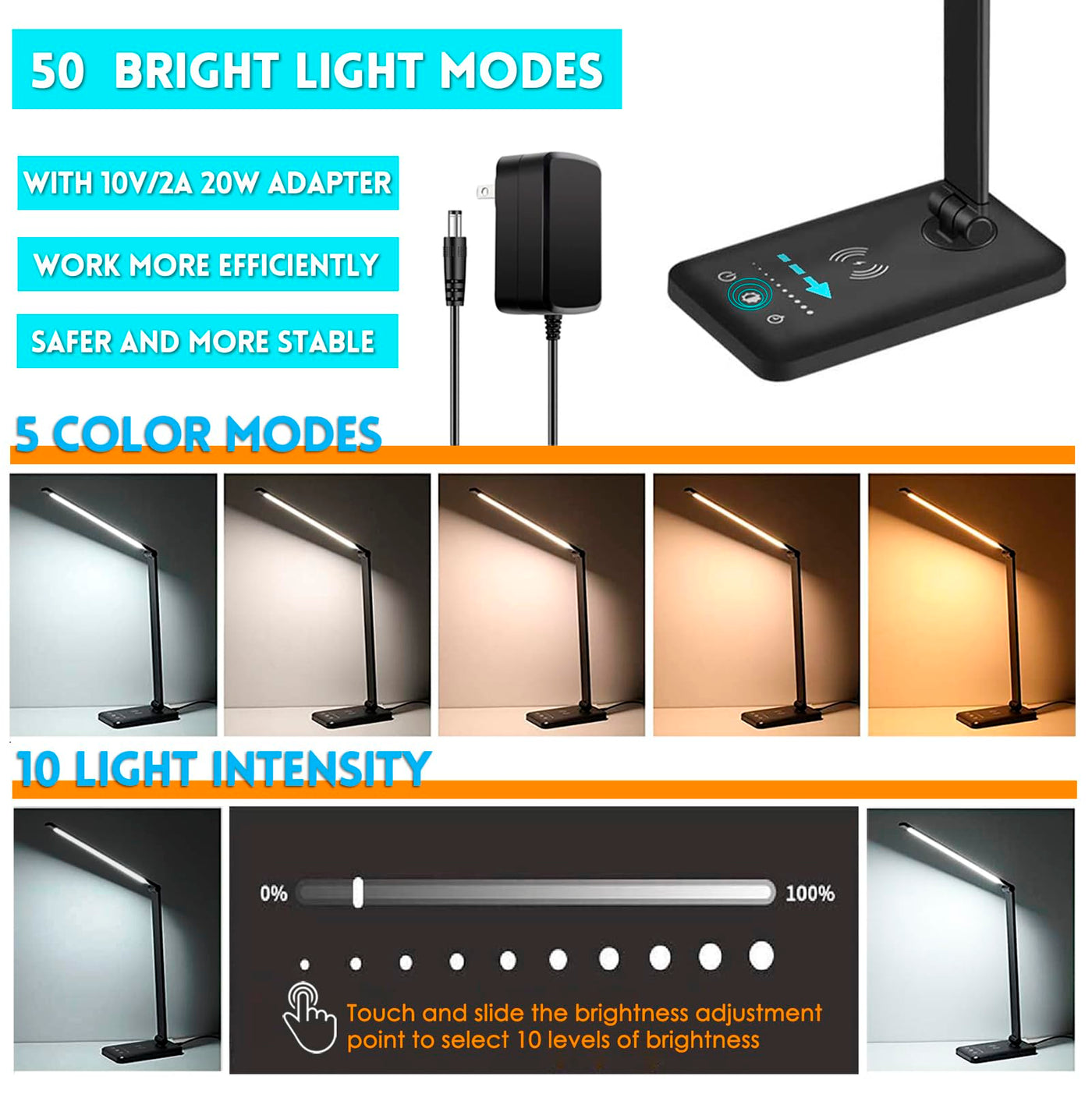 This Is A Powerful Table Lamp, Jositc Led Desk Lamp With Wireless Charging It Is Equipped With Touch Dimmer, Memory Function, No Glare Reflects On Screen, Usb Charging Port, Foldable,30/60 Min Auto Timer, Eye-Caring, Who Eye Caring Program Technology! Modern Design, Streamlined Appearance Is Suitable For Any Type Of Decoration, Including Home Offices, Living Rooms, Bedrooms, College Dormitory, And Other Places. Product Specifications: Power:8W Rated Voltage: Dc10V/2A Light Source:60 Pcs&Nbsp; Color Temperature Range:3000K~5500K Material: Aluminum Alloy Packing List: 1* Led Desk Lamp&Nbsp; 1* Power Adapter&Nbsp; 1* User Manual&Nbsp; 1* Package Box !!!Note: 1. The Minimum Voltage Required For Wireless Charging Is 5V / 1A.&Nbsp; 2. When Using Wireless Charging, We Recommend That You Close Large Applications Or Games, Remove The Phone Case, Metal Ring, And Other Accessories, So That Charging Will Be More Efficient. 3. The Desk Lamp Supports Wireless Charging. To Use The Desk Lamp Wireless Charging Function, The Premise Is That The Mobile Phone Supports The Wireless Charging. If You Have Any Questions, Please Feel Free To Contact Us, We Are Always At Your Service.