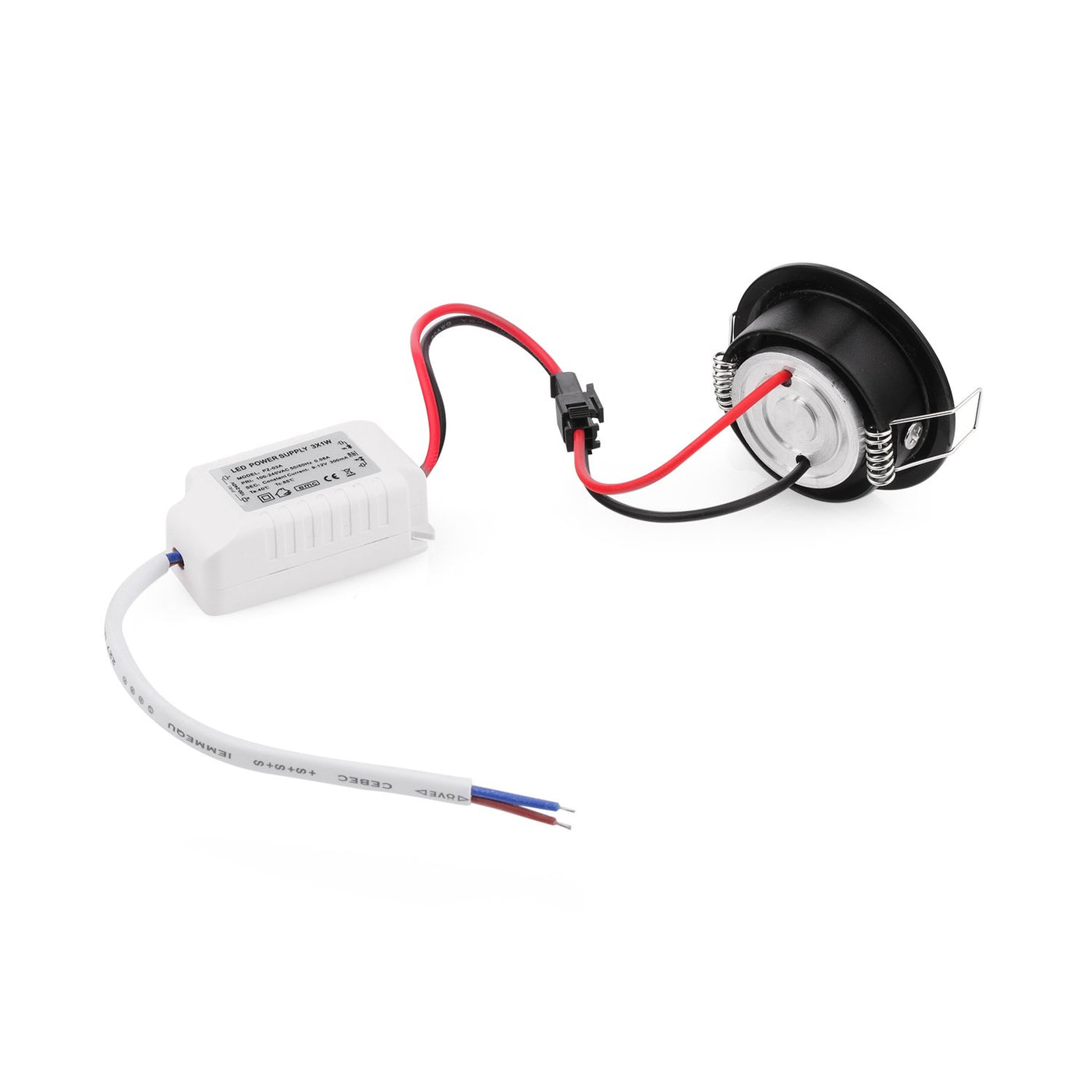 Mini 3W LED Recessed Downlight Complete Kit - Pack of 10 incl. Power Supply and 1 Wiring Set - Round Head, Natural White Warm White The LED has a very high color rendering index of 80Ra, it can show the true natural colors of the lighting object, which is very critical for showcase lighting. Electrical Characteristcs 1. Power: 1*3 Watt 2. LED input: 3.1-3.4V DC 3. LED Current: 600-650mA 4. Power supply: AC90-260V input 5. Dimmable: NO Photometric Characteristcs 1. Luminous flux: 220lm 2. Color rendering index: 80Ra 3. Light color: Warm white 3000K 4. Beam angle: 45 degree General Characteristcs 1. Material: Aluminum 2. Finishing: Silver 3. LED type: BridgeLUX 4. LED quantity: 1pcs 5. LED spotlight size: 52 * 20mm 6. Cutout: 41-45mm 7. Rated lifespan: 50,000 hours 8. Safety: CE & RoHS compliant Package includes - 10pcs 3W Mini LED downlights - 10pcs power supply