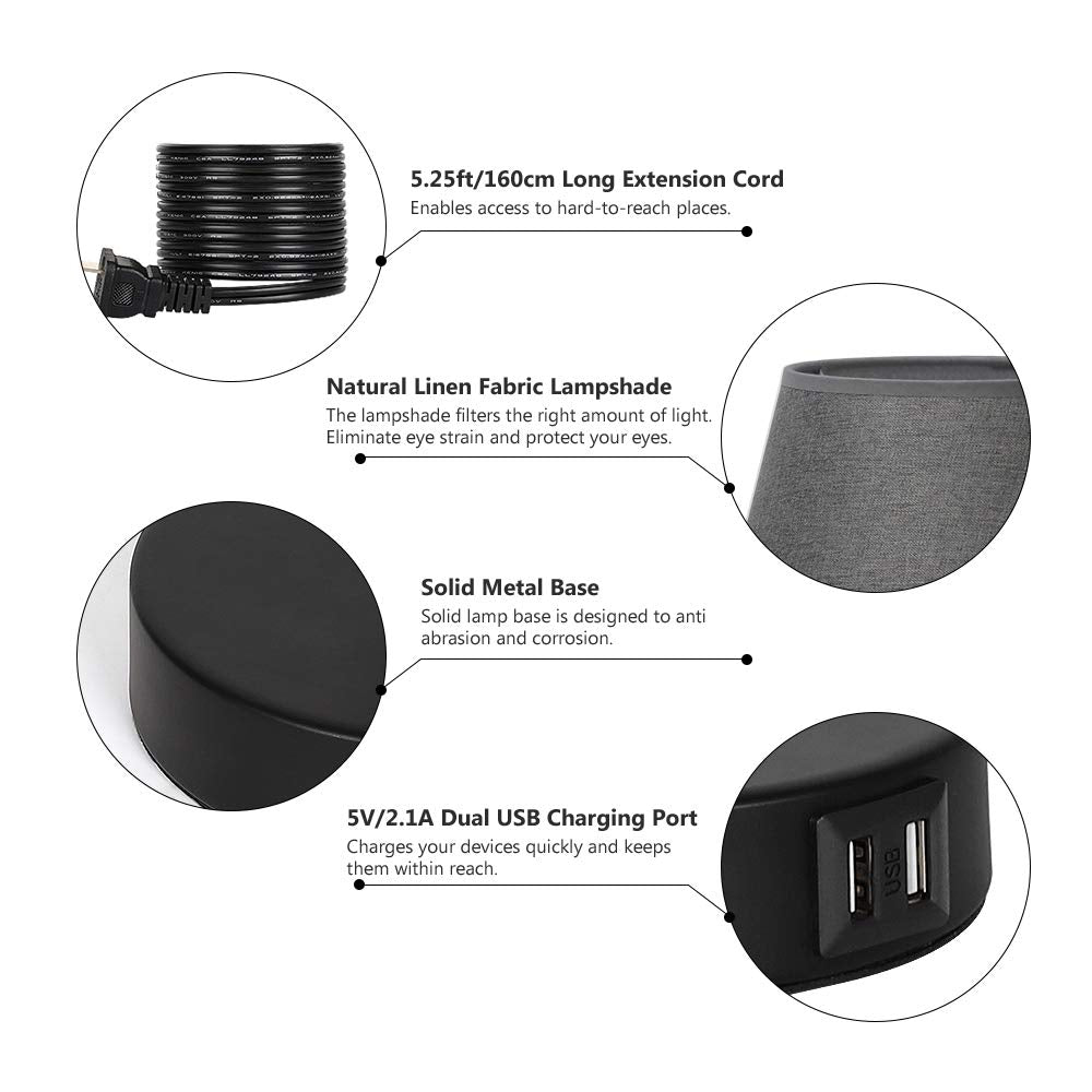 Js Nova Juns Bedside Table Lamps With Dual Usb Charging Ports, Set Of 2 Modern Lamps With Gray Fabric Shade, Stylish Desk Lamp F