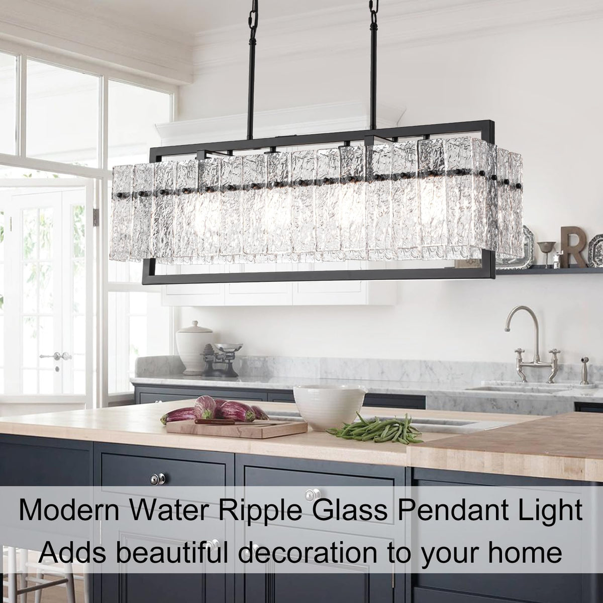 Jsdorsy Modern Large Rectangle Chandeliers For Dining Room, 4 Lights Black Crystal Kitchen Island Lighting With Water Ripple Gla