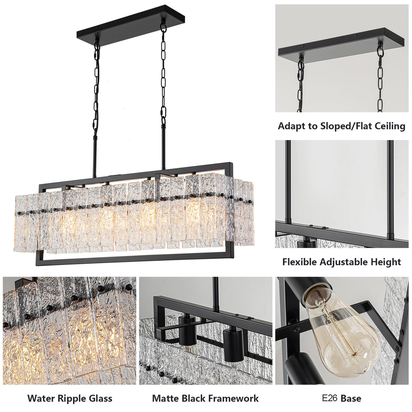Q: Is the JSDORSY chandelier suitable for a dining room?A: Absolutely! The JSDORSY chandelier's large rectangular design and elegant water ripple glass make it a perfect lighting fixture for dining rooms, as well as bedrooms, living rooms, entryways, and hallways.