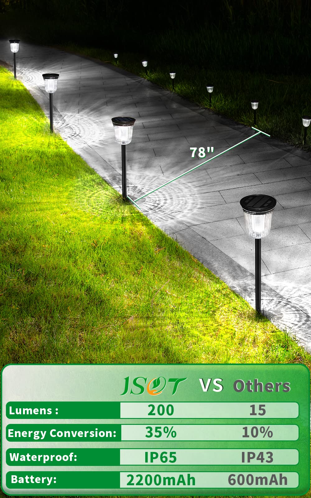 - **Ultra-High Light Lumen Output**: Experience superior brightness with an ultra-high lumen output of 200, significantly outperforming ordinary solar lights. The beam radius of 78 inches allows a single JSOT solar garden light to illuminate a larger area than multiple low-lumen solar pathway lights.