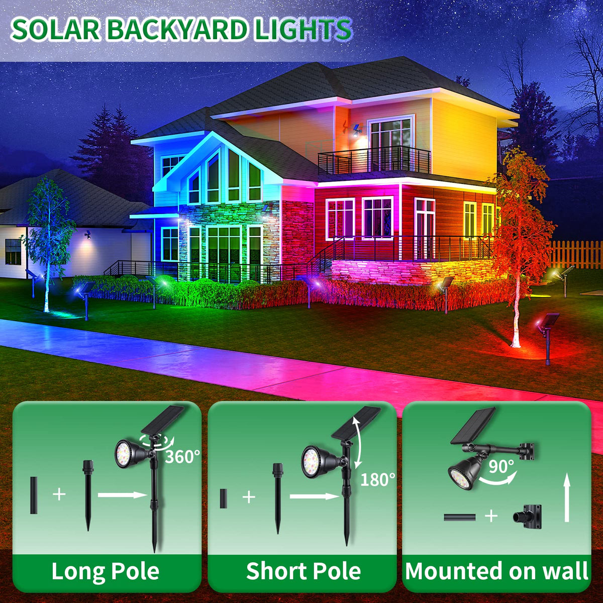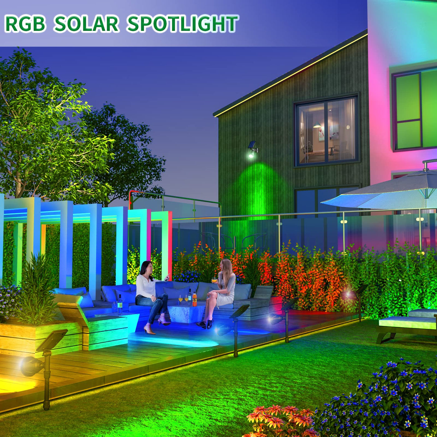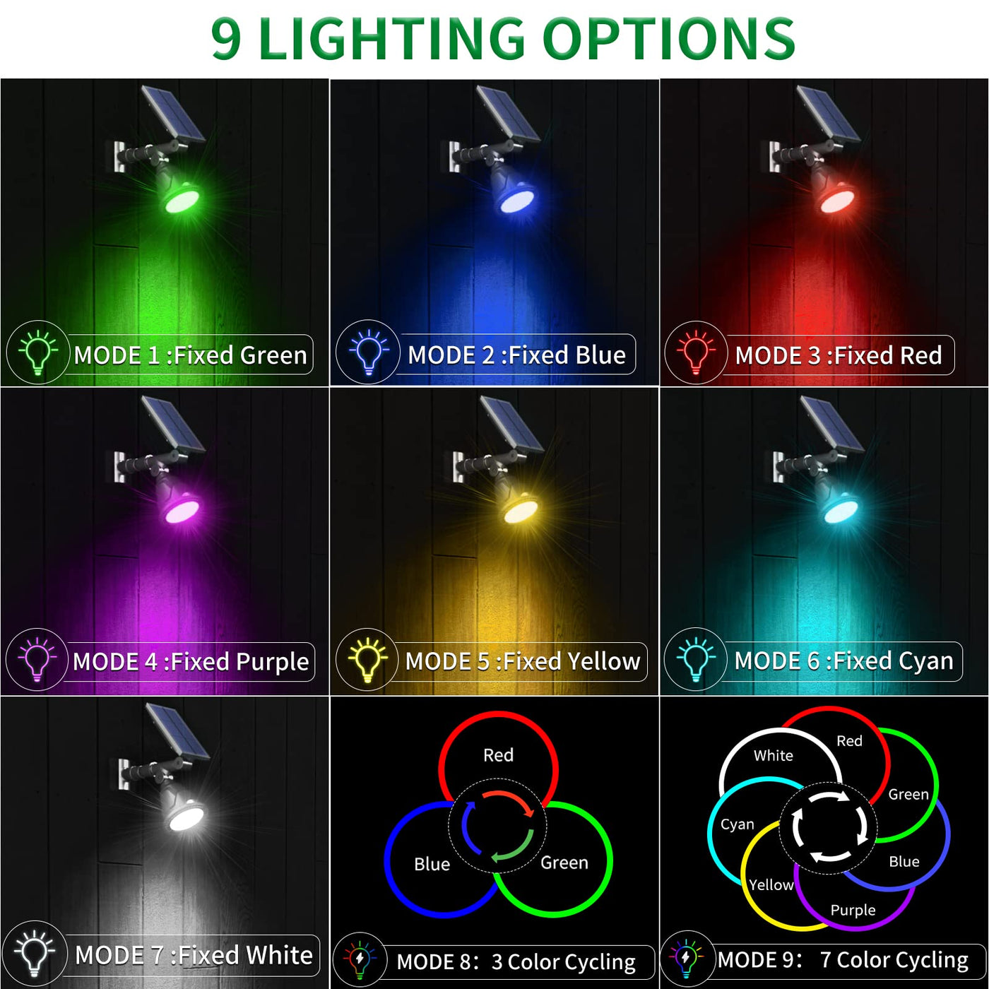 Q: What are the lighting modes available for these solar spotlights?A: These solar spotlights feature 9 lighting modes, including 7 fixed colors (Red, Green, Blue, Purple, Warm White, Cool White, Cyan) and 2 cycling modes (Red, Green, Blue cycling and all 7 colors cycling). This variety allows you to customize the lighting to suit any occasion, from daily use to holiday celebrations.