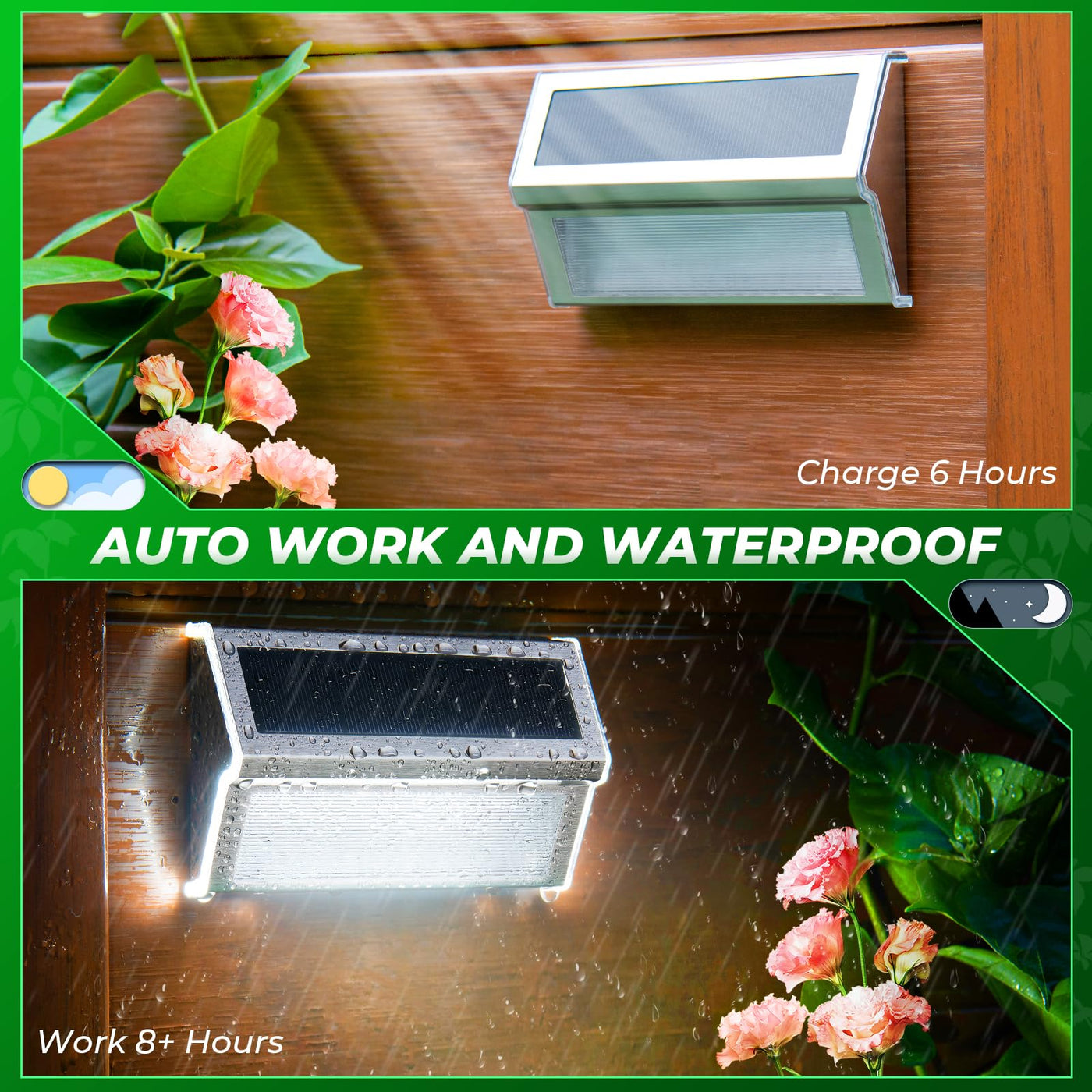 Q: How do JSOT Solar Step Stair Lights work?A: JSOT Solar Step Stair Lights are equipped with built-in light sensors that automatically turn the lights on at dusk and off at dawn. They charge during the day using solar energy, providing illumination for 6-8 hours after sunset.
