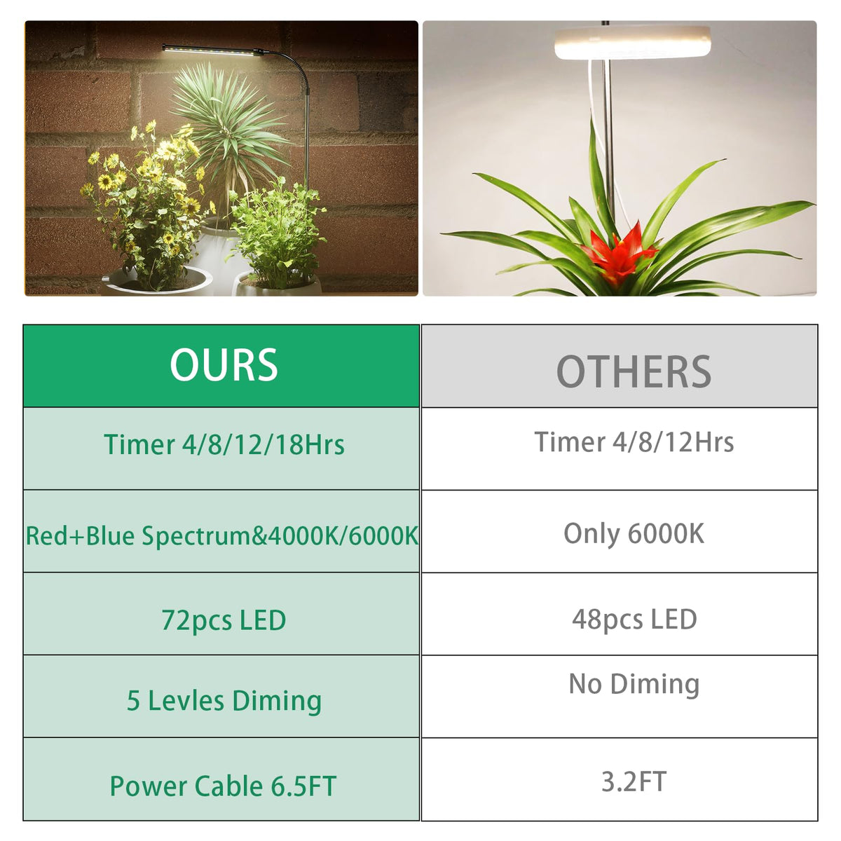 Q: What are the different color spectrums available in the Juhefa LED Grow Light?A: The Juhefa LED Grow Light features three color spectrums: 6000K White light, Red & Blue light, and 4000K White light. These options allow you to choose the best spectrum based on the specific needs of your plants to enhance photosynthesis.