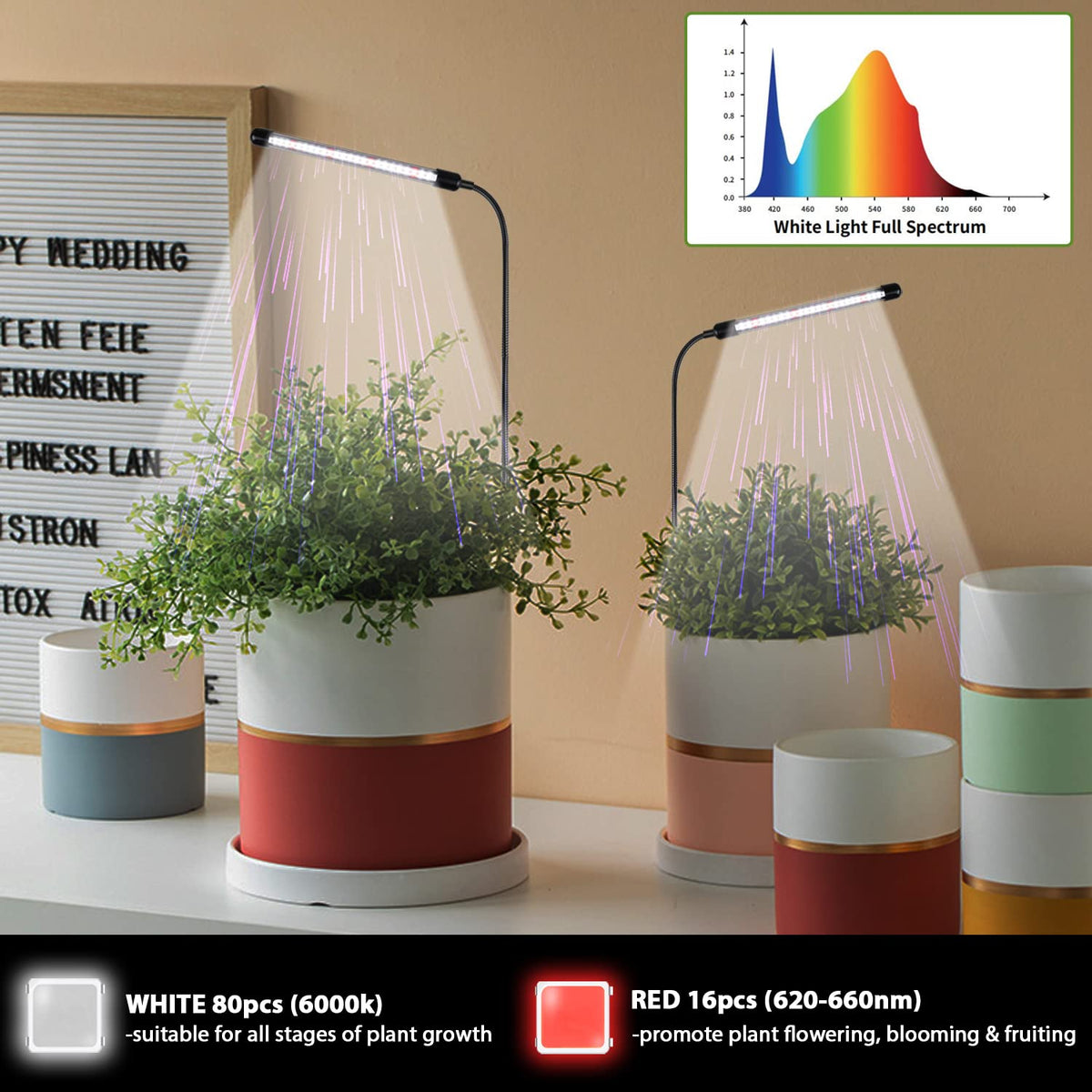 Q: What is the optimal light spectrum for indoor plants?A: The Juhefa Plant Grow Light features a 6000K white full spectrum combined with 660nm red bulbs, providing the ideal light spectrum to promote photosynthesis in indoor plants.