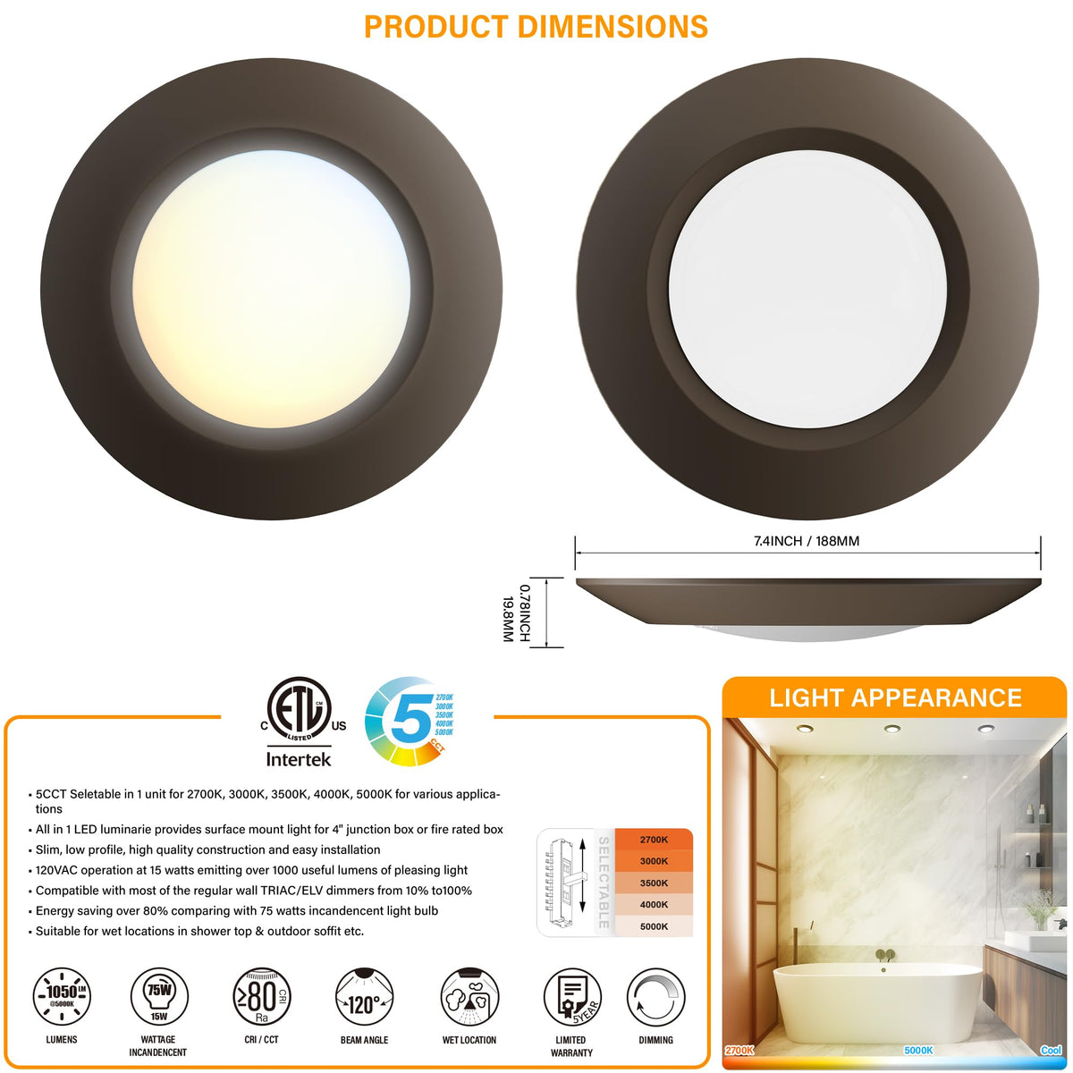 Jullison 8 Packs 6 Inch Led Low Profile Screw In & Surface Mount Disk Light, Oil Rubbed Bronze, 5Cct Field Selectable, Round, 15