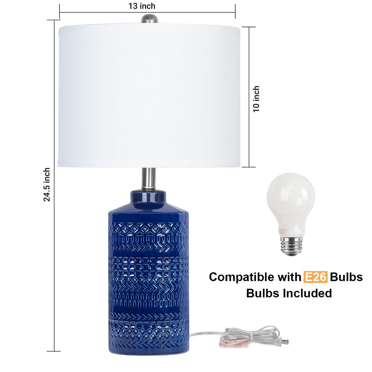 Specification:- Input Voltage: 110V~130V, Us Plug- Power Cord Length: 60 Inches- Color: White Lampshade/ Navy Blue Ceramic Base- Material: Ceramic Base, Fabric Shade- Bulb Requirement: E26, Max 60W- Lamp Size: 24.5 (H) X 13 X 6 Inches,- Power Source: Corded Electric- Package Include: 1 X Ceramic Base, 1 X Lampshade , 1 X Horn Frame+Finial Cap Knobs, 2 X Kd Lampshade Ring, 1 X Led Bulb, 1 X User Manual