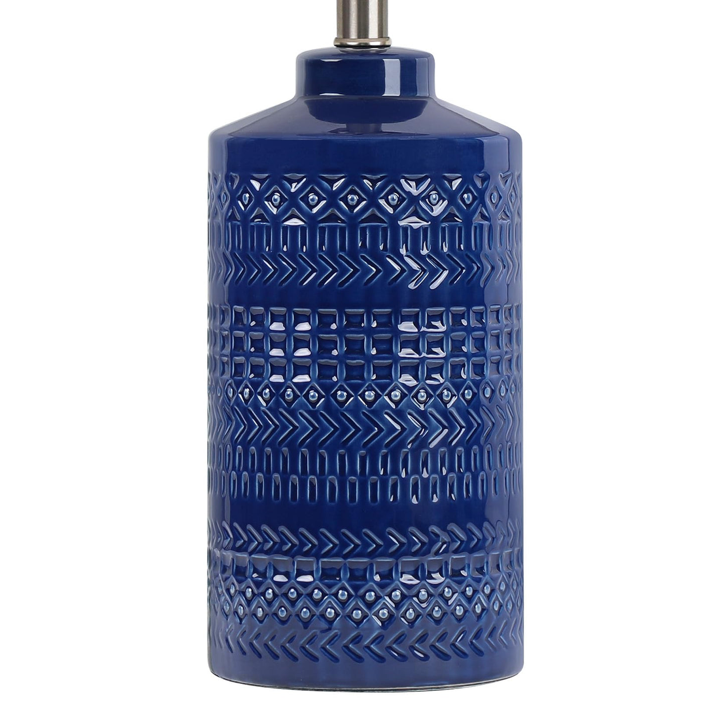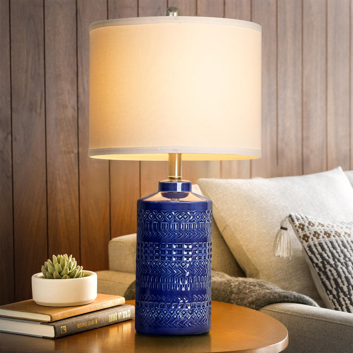 Q: What is the height and width of the JUNNAI Navy Blue Table Lamp?A: The JUNNAI Navy Blue Table Lamp stands 24.5 inches tall and has a base width of 6 inches, making it a perfect size for bedside tables, living rooms, or office desks.