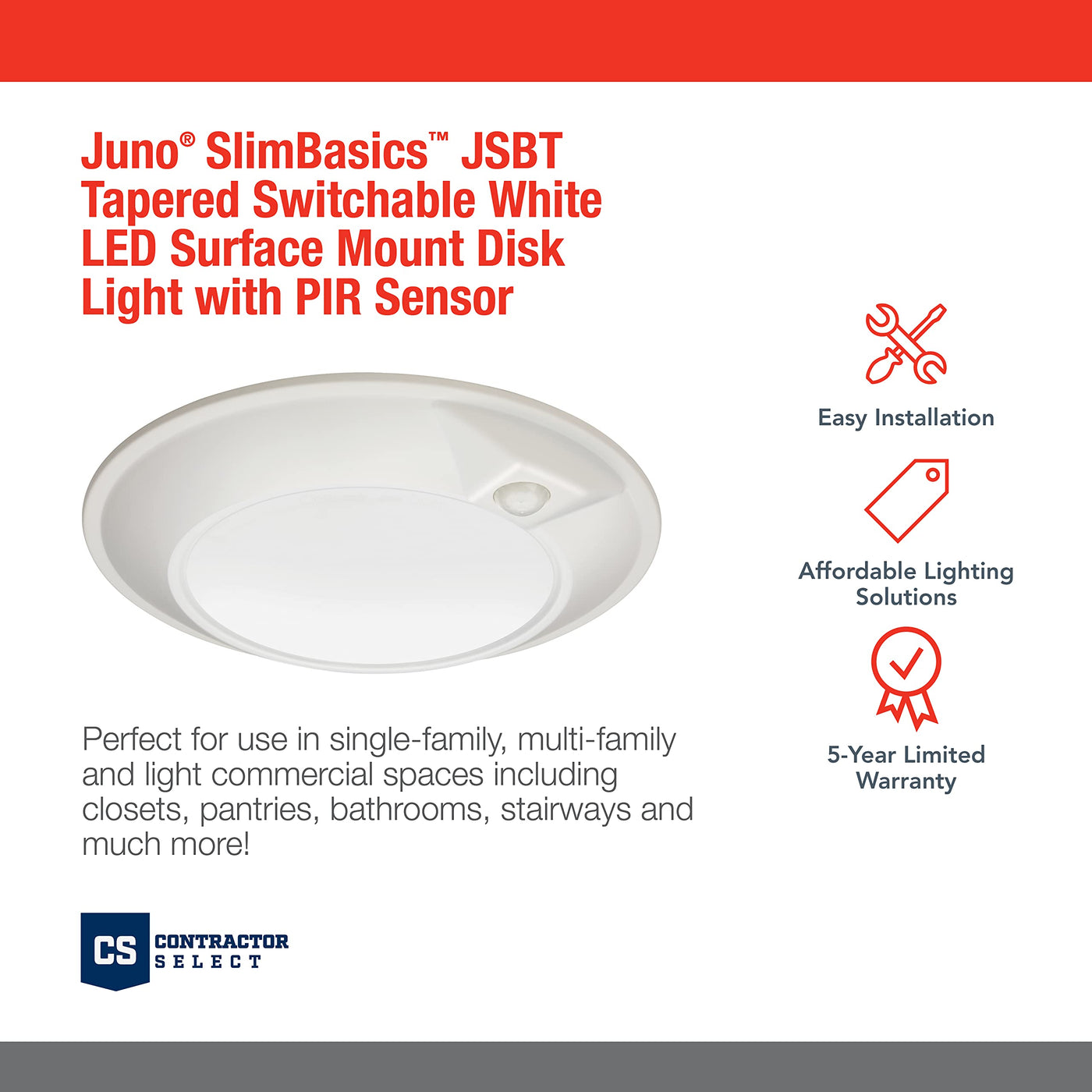 The Juno Slimbasics 6In Jsbt Slim Tapered Switchable White Led Disk Light Is Designed To Be The Lowest Total Installed Cost Solution For Residential Spaces. The Matte White Aluminum Housing Is Aesthetically Pleasing Bringing A Design Element That Blends With Any D Cor. The Jsbt Features A Switchable White Color Temperature Switch On The Back Of The Product Allowing You To Choose Between Three (3) Easy Color Temperature Adjustments (3000K Warm White, 4000K Cool White, Or 5000K Daylight), Plus It Includes A Passive Infrared (Pir) Sensor That Provides Automatic Light Activation When Someone Enters The Room And Is Factory Set To Automatically Turn Off After 40 Seconds Of No Movement Making It The Perfect Solution For Closets, Pantries, Hallways, Stairways, Bathrooms And Much More!