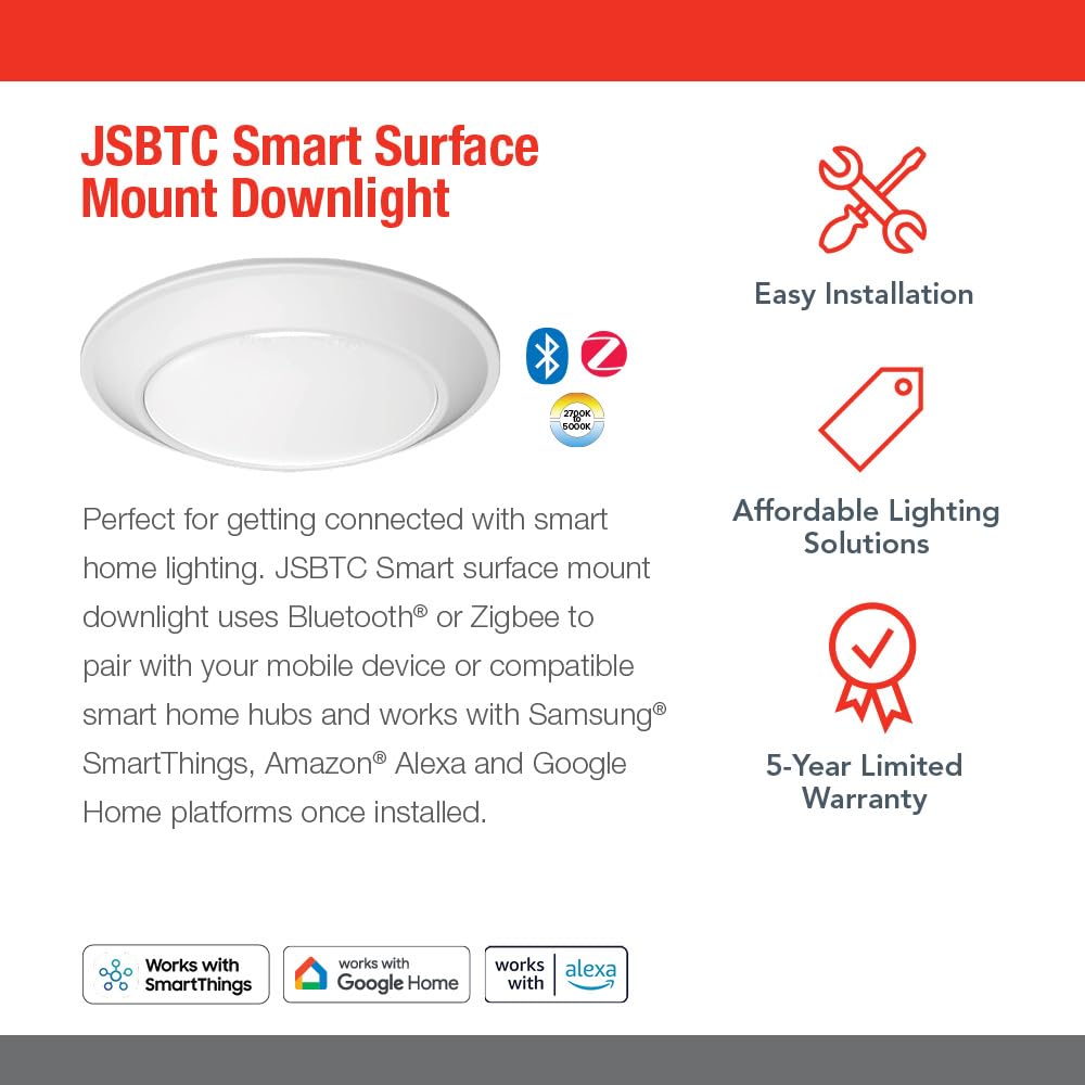 The Juno Jsbtc Smart Surface Mount Disk Light, Available In 6In, Is The Perfect Way To Get Connected With A Smart Home Lighting Solution. Designed To Provide Good Quality Lighting, While Also Being Budget Friendly, The Jsbtc Is The Lowest Total Install Cost For A Smart Led Solution For Single And Multi-Family Applications. The Jsbtc Uses Bluetooth Or Zigbee To Pair To Your Mobile Device Or Compatible Smart Home Hub Platforms Once Installed. When Paired With A Compatible Smart Home Hub You Can Enable Voice Control, Time Schedules, And Groups To Control The Lighting Throughout Your Home.