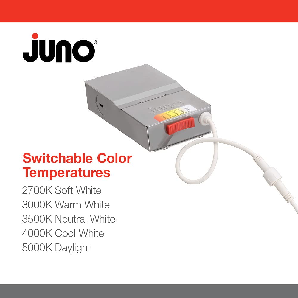 Q: What color temperatures can I choose from with the Juno LED Recessed Lights?A: The Juno LED Recessed Lights feature a 5-in-1 switchable option that allows you to choose from five color temperatures: 2700K Soft White, 3000K Warm White, 3500K Neutral, 4000K Cool White, and 5000K Daylight.