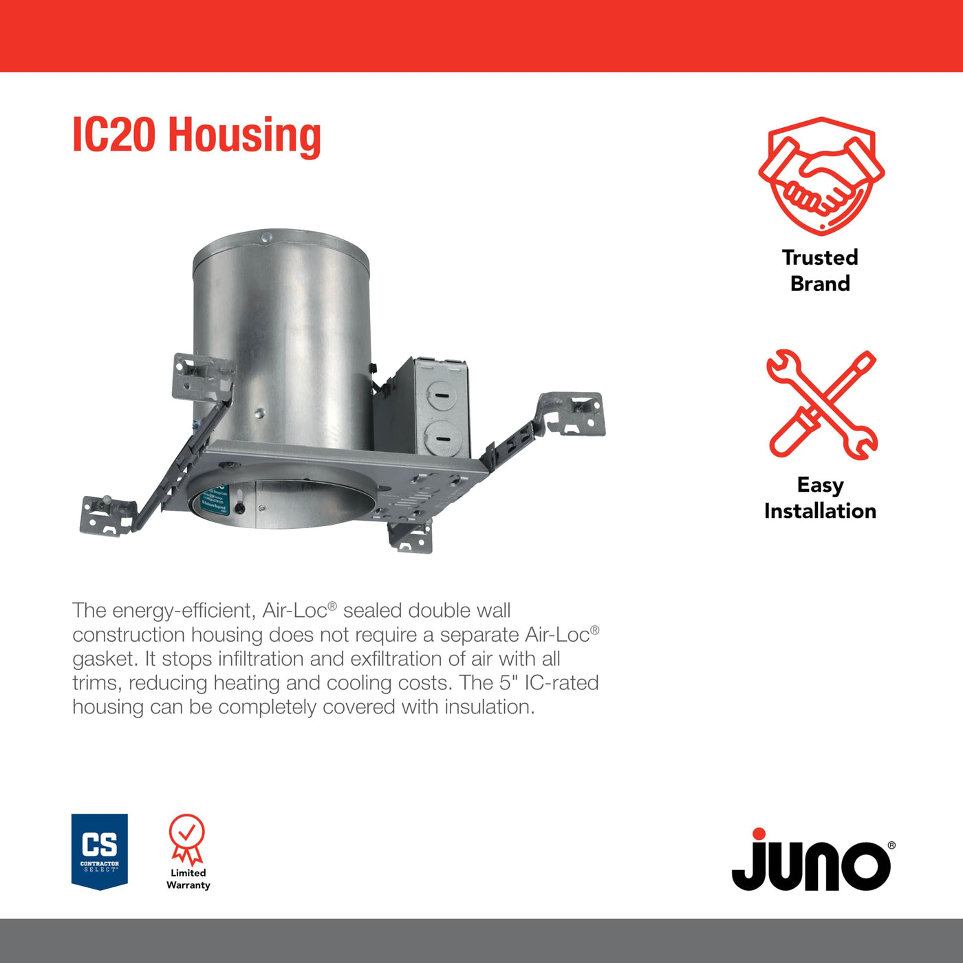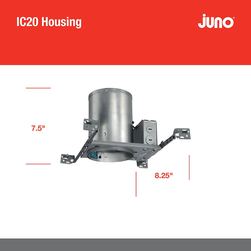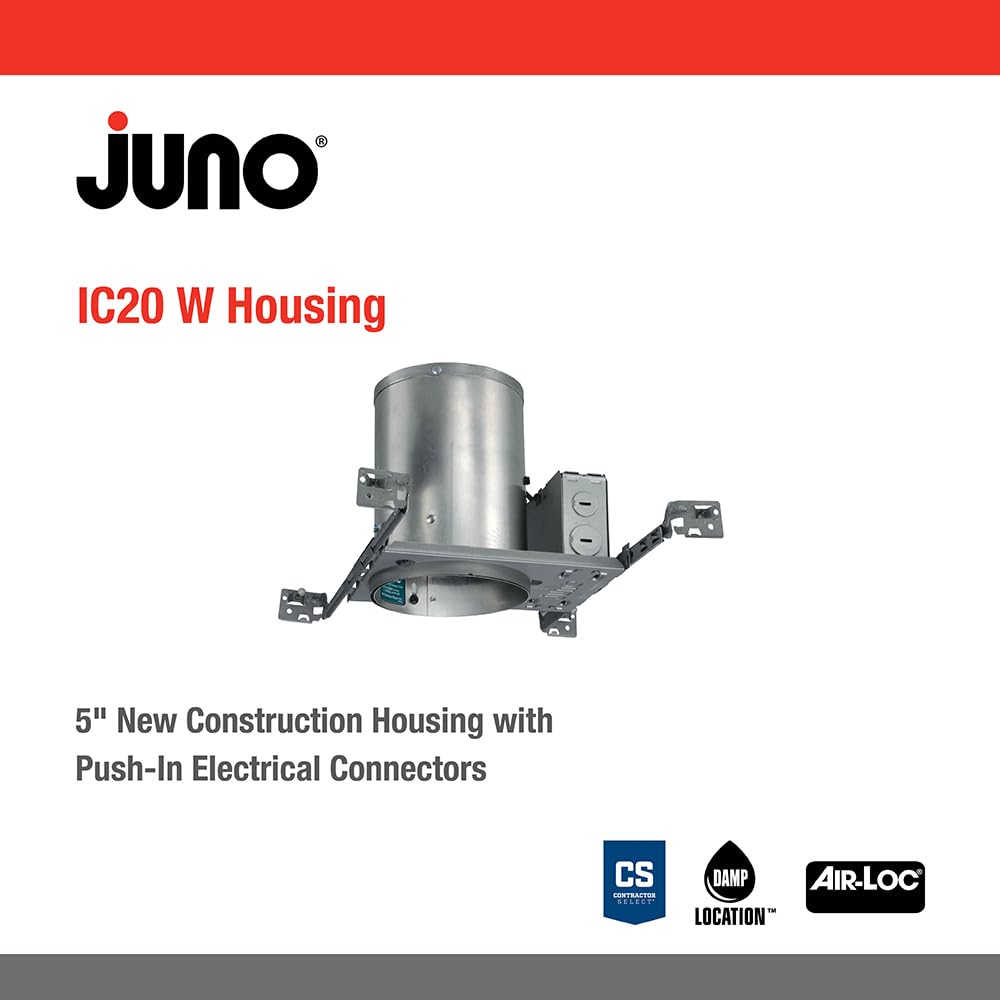 Product Descriptionthe Ic20 5-In. Incandescent Universal Ic Housing By Juno Includes Drop Socket With Spring To Accommodate Certain Trim Installationfrom The Manufacturerthe Ic20W 5-Inch Downlight Incandescent Housing Is An Ic Rated, Energy Efficient Air-Loc Sealed New Construction Housing. The Housing Has A Drop Socket With Spring To Accommodate Various Trim Installations And Contains A Medium Base Porcelain Socket With Nickel-Plated Copper Screw Shell That Accepts An Incandescent Light Bulb. Bulb Wattage Ratings And Apertures Are Based On Trim Selection. When Used With Air-Loc Gasket (Alg5, Sold Separately), Stops The Movement Of Air, In Or Out, Reducing Heating And Cooling Costs. Installation Of The Ic20W Is Made Easy With The Real Nail 3 Telescoping System Featuring Bugle-Headed Nails For Easy Repositioning Of Housing In Joist Construction And Integral T-Bar Clip To Secure Housing In Suspended Ceiling Grid. The Ic20W Is Supplied With A Pre-Wired Junction Box With (5) 1/2-Inch And (1) 3/4-Inch Knockouts, (4) Non-Metallic Sheathed Cable Connectors, Ground Wire. A Shadow-Free, Knife-Edge Trim Design Blends Smoothly In To The Ceiling And Allows Architectural Continuity With Aculux Trims (Sold Separately). Ul Listed, C-Ul/Csa Certified For Through-Branch Wiring, With A Maximum Of (8) 12-Awg Conductors. Wet Location Listed When Using A 210, 211 Or 212 Trim. The Wet Listing Also Includes The 215 And 216 Trims When Used With Par30 Outdoor Rated Bulbs. All Trims Are Sold Separately And Come In A Wide Variety Of Styles And Finishes To Customize To Your Needs, Including The 201, 203, 204, 205, 206, 207, 208, 209, 529, 688 Or 689 Trims. Meets Washington State Iecc And Mec Energy Codes As Tested Per Astm-E283 And Conforms To City Of Chicago Ip Requirements. Building On Over 30 Years Of Leadership In Recessed Lighting, Juno Down-Lites Are Renowned For Their Versatility, Efficiency And Economy. Whether Its General Downlighting, Wall Washing, Or Accent Lighting, Juno Recessed Fixtures Will Help Make Your Vision A Reality. Juno Lighting Group'S Warranty Period For General Lighting Products Is One Year From Date Of Purchase.