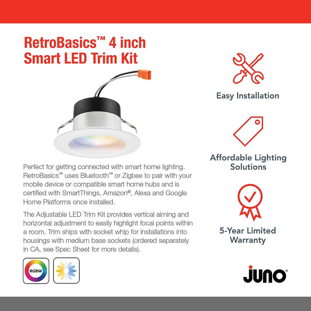 The Juno Retrobasics 4 Inch Smart Recessed Led Trim Kit Is The Perfect Way To Get Connected With Smart Home Lighting. The Smart Retrobasics Uses Bluetooth Or Zigbee To Pair To Your Mobile Device Or Compatible Smart Home Hubs. The Smart Downlight Is Also Certified With Smartthings, Amazon Alexa, And Google Home Platforms Once Installed. Available In 4 Inch And 5/6 Inch Sizes, The Smart Downlight Also Features A Regressed Lens To Aid In Glare Control While Giving The Product A More Traditional Aesthetic.