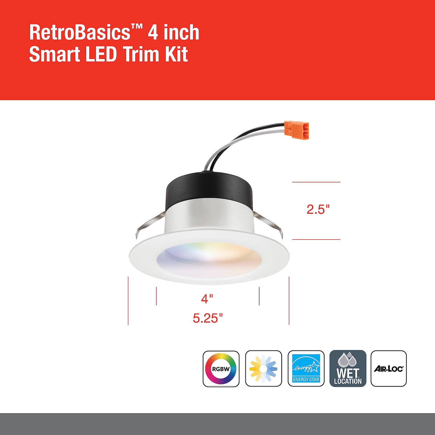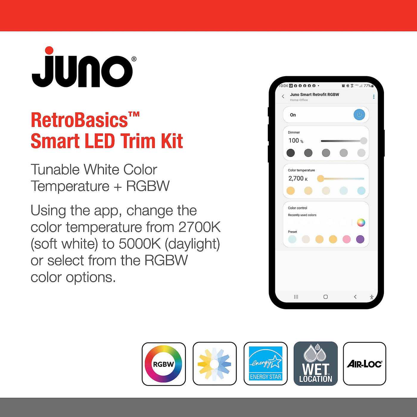 Juno Rb4Sc Rgbw Mw L/Sktwhip M6 Retrobasics Smart Recessed Led Trim Kit, Tunable White 2700K - 5000K, Rgbw Color Changing, Smoot