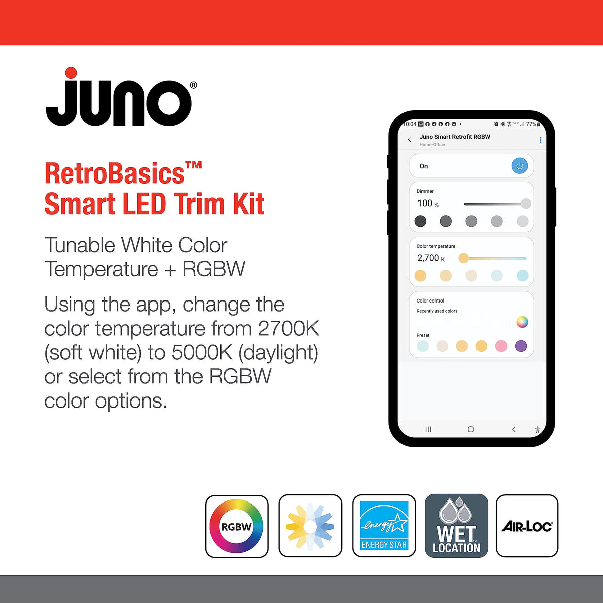 Q: What is the color temperature range of the Juno RB4SC Smart Trim Kit?A: The Juno RB4SC Smart Trim Kit offers tunable white lighting from 2700K to 5000K, along with RGBW color changing options, allowing you to customize the ambiance in your space.