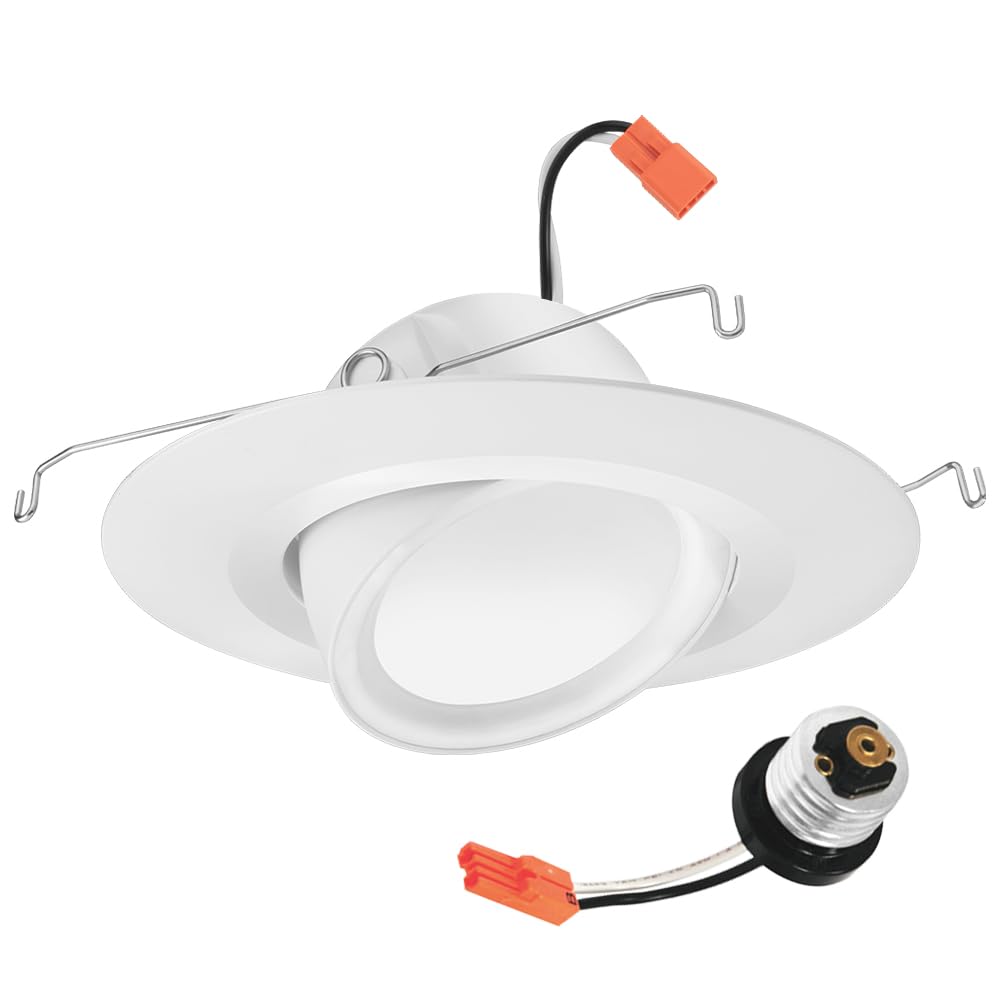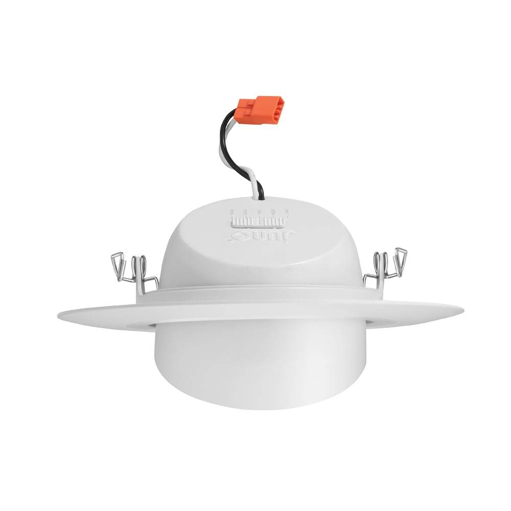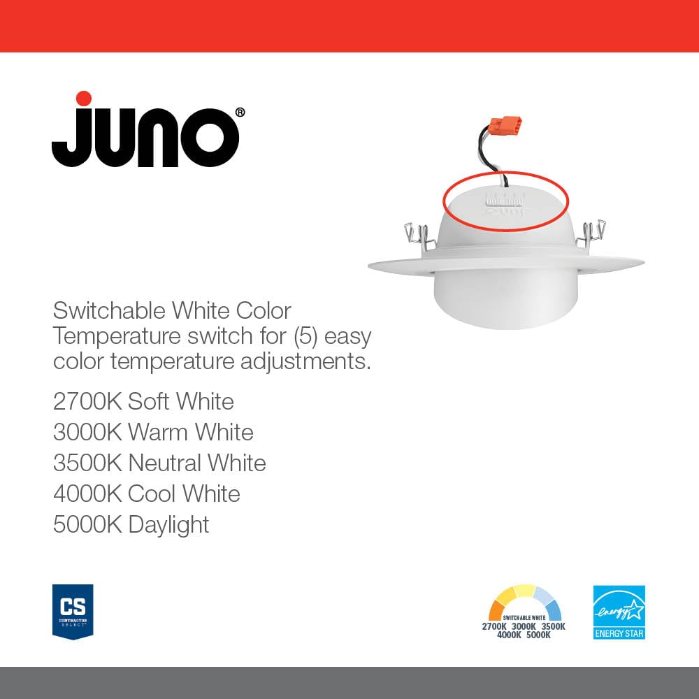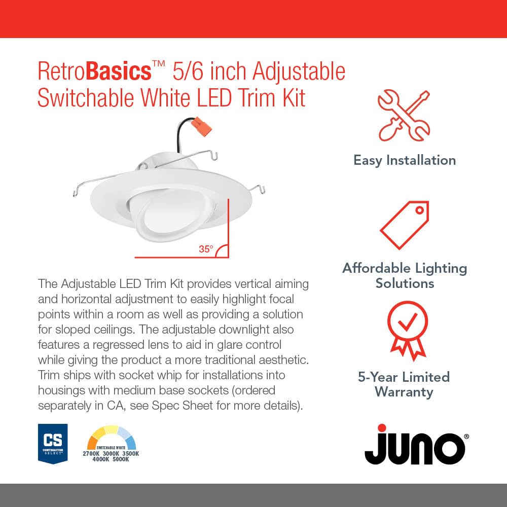 The Juno Retrobasics 5/6 Inch Switchable White Adjustable Recessed Led Trim Kit Is The Perfect Solution For Any Residential Or Light Commercial Setting. The Adjustable Gimbal Design Provides Up To 35 Degree Vertical Aiming And Horizontal Adjustment To Easily Highlight Focal Points Within A Room As Well As Providing A Solution For Sloped Ceilings. Available In 4 Inch And 5/6 Inch Sizes, The Retrobasics Downlight Is Designed To Replace Trims And Lamps In Existing Housings Or Designed To Pair Perfectly With The New Quick Connect Housing By Juno For A Low-Cost Led Downlight Solution.