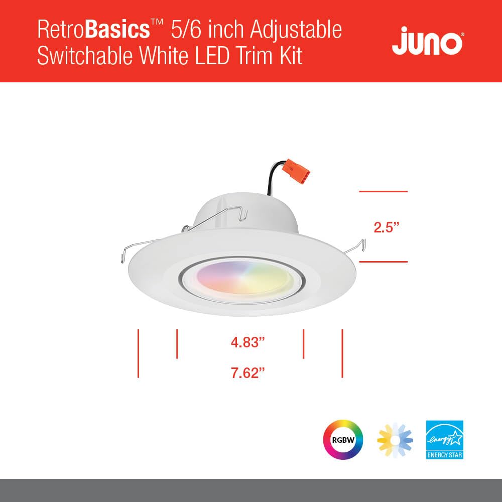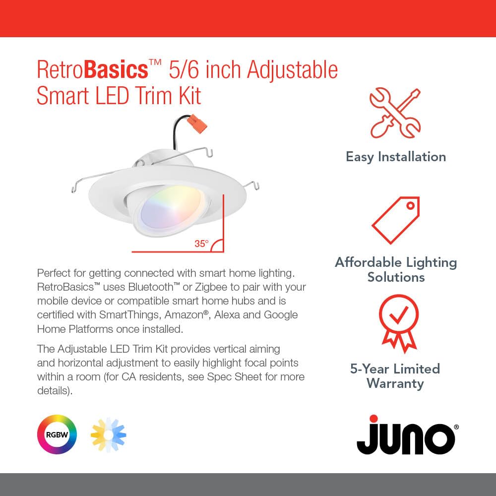 The Juno Retrobasics 5/6 Inch Smart Adjustable Led Recessed Trim Kit Is The Perfect Way To Get Connected With Smart Home Lighting. The Smart Retrobasics Uses Bluetooth Or Zigbee To Pair To Your Mobile Device Or Compatible Smart Home Hubs. The Smart Downlight Is Also Certified With Smartthings, Amazon Alexa, And Google Home Platforms Once Installed. The Adjustable Gimbal Design Provides Up To 35 Degree Vertical Aiming And Horizontal Adjustment To Easily Highlight Focal Points Within A Room As Well As Providing A Solution For Sloped Ceilings. Available In 4 Inch And 5/6 Inch Sizes, The Adjustable Downlight Also Features A Regressed Lens To Aid In Glare Control While Giving The Product A More Traditional Aesthetic.