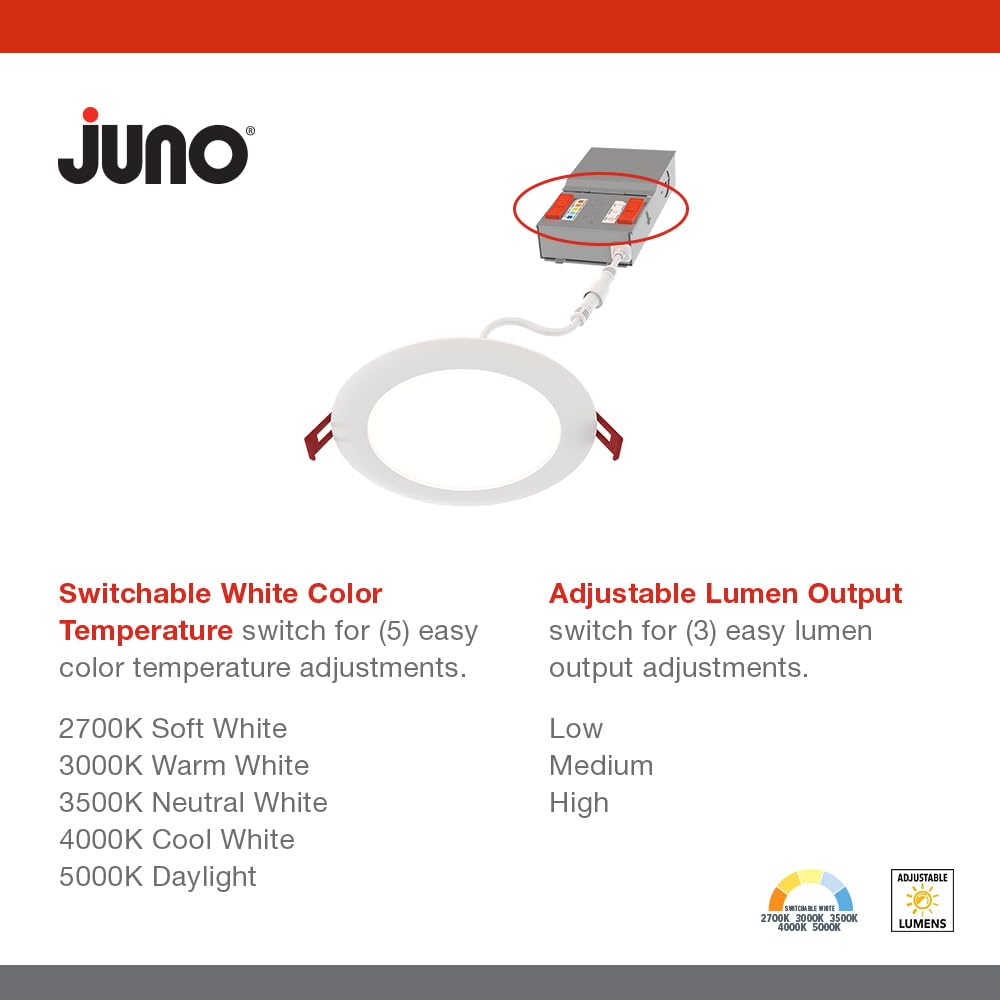 Q: What color temperatures can I choose with the Juno LED Recessed Lights?A: The Juno LED Recessed Lights offer a switchable feature that allows you to choose from five color temperatures: 2700K Soft White, 3000K Warm White, 3500K Neutral, 4000K Cool White, and 5000K Daylight. This versatility helps you match the lighting to your room's atmosphere.