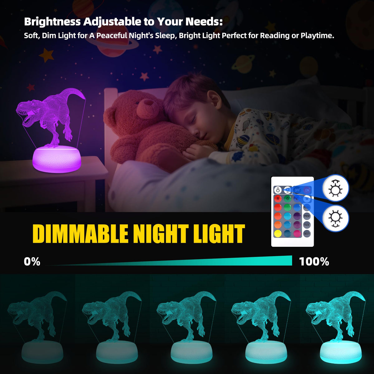 JURHHOEN Dinosaur Night Light, Night Light for Kids - Third-Generation 3D Acrylic Night Light, 16 Color Changing Lamp with 3 Din