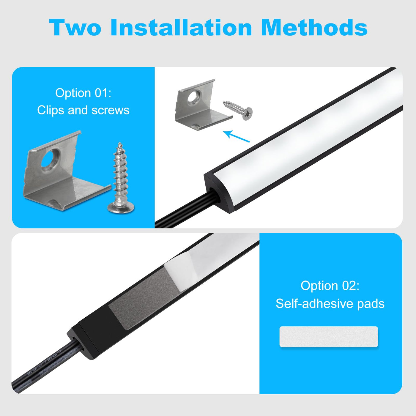 Q: What surfaces can I mount the LED lights on?A: The LED light bars can be mounted using self-adhesive tape, mounting clips, or screws, making them versatile for various surfaces including wood, metal, and plastic.