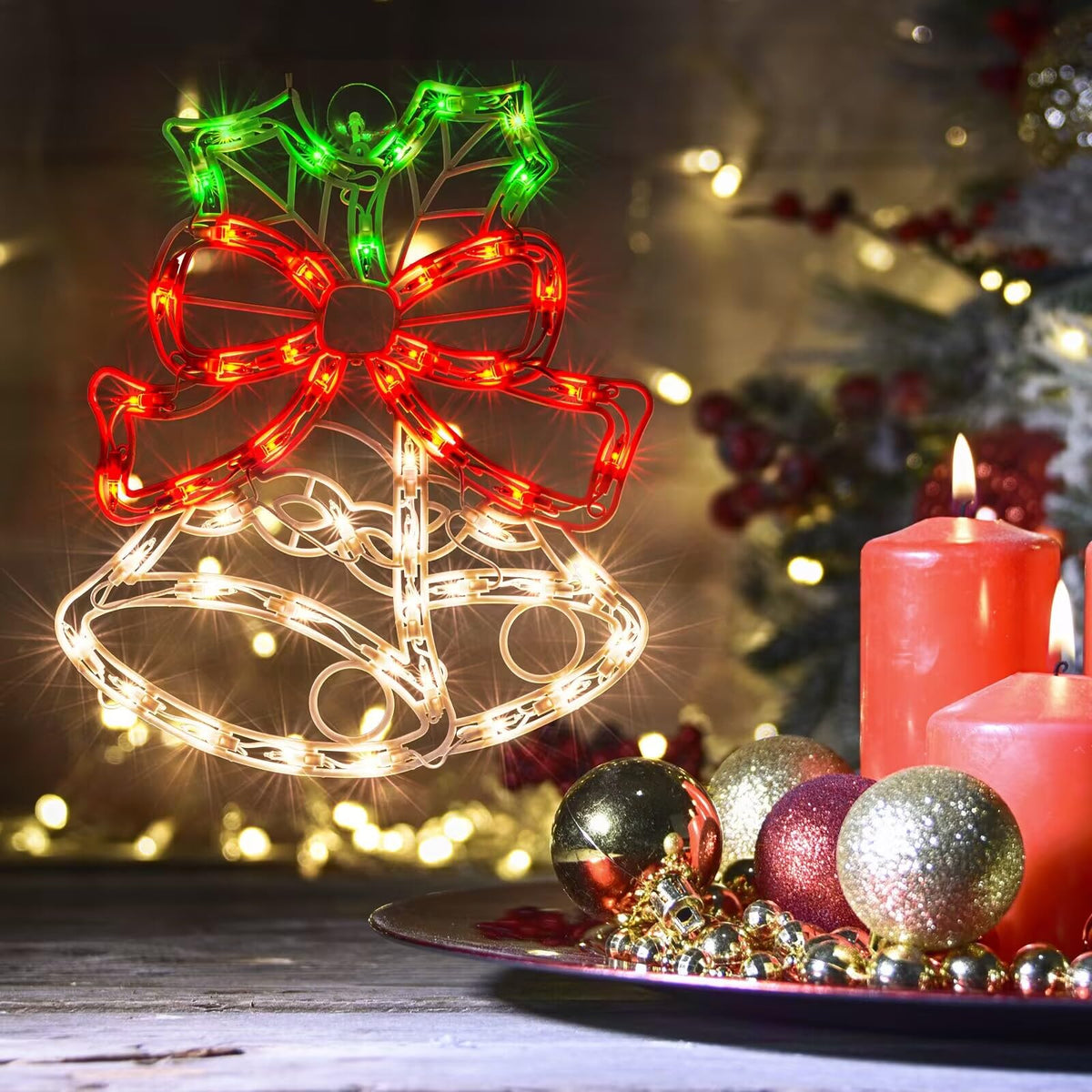 JUSTPRO Christmas Window Silhouette Lights, Lighted Bells Double Sided Decorations with 50 Count Incandescent Mini Light, for Holiday Indoor Wall Door Glass Decor