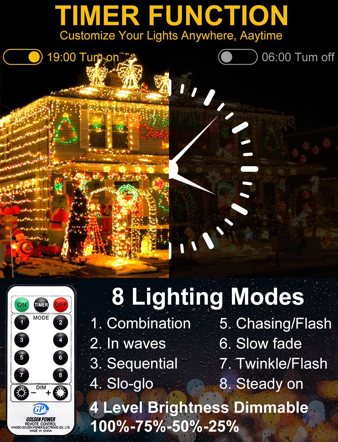 - **8 Lighting Modes & Timer Function**: Choose from 8 different lighting modes, including Twinkle, Steady On, and Slow Fade, to create the perfect atmosphere. The built-in timer allows for 6 hours on and 18 hours off, ensuring hassle-free operation.