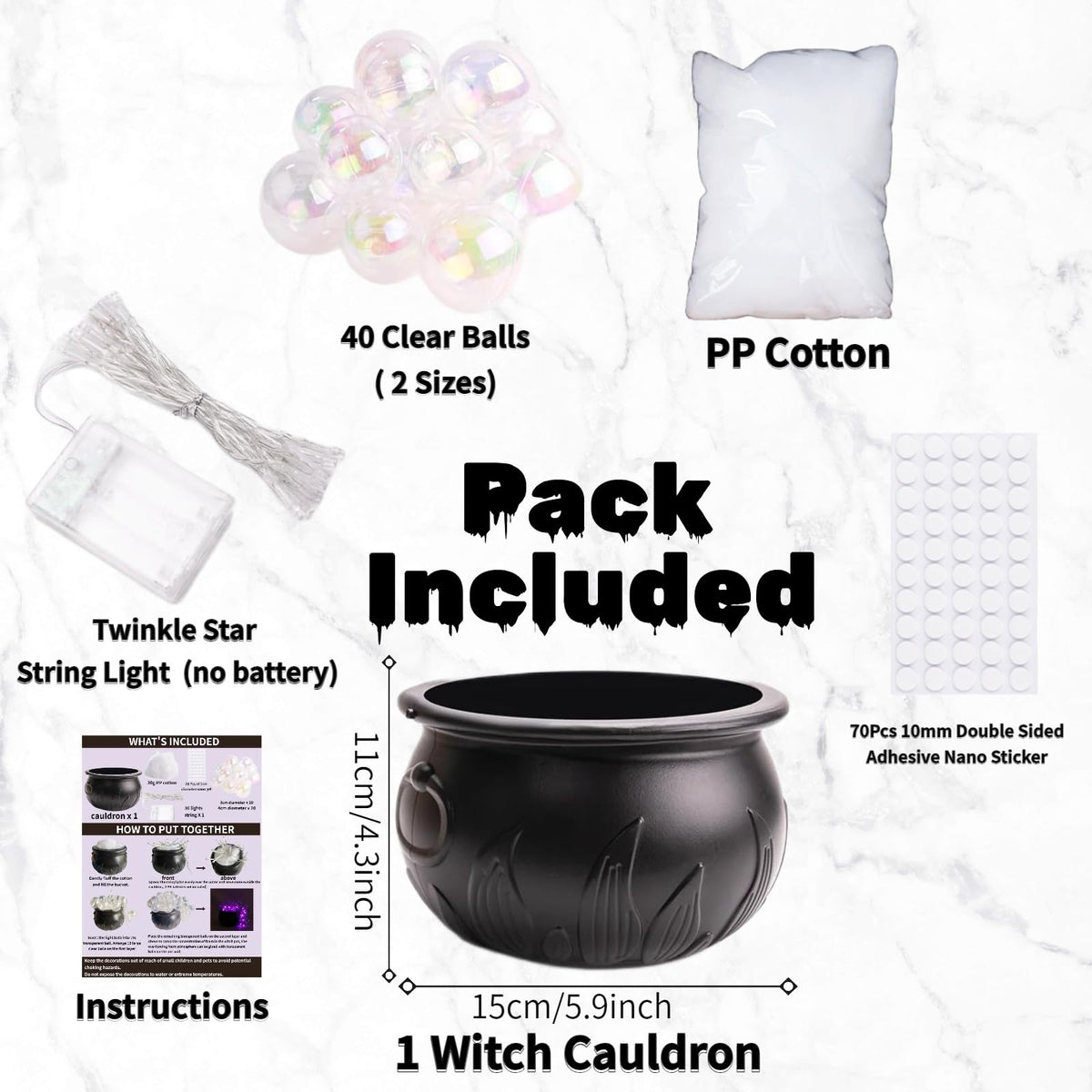Q: What is included in the Jxueych Halloween cauldron set?A: The Jxueych Halloween cauldron set includes a witches cauldron, thirty grams of cotton filling, forty clear ornament balls, glue point dots, and a string of twinkling lights, providing everything you need for a festive decoration.