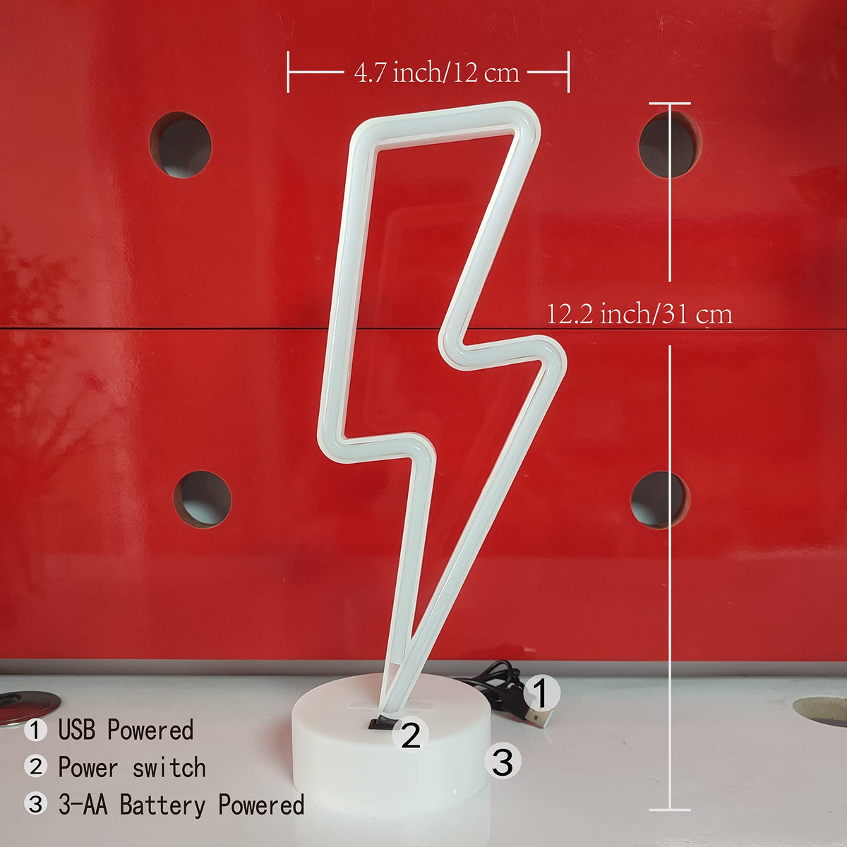 Q: What are the power supply options for the JYWJ Lightning Neon Sign?A: The JYWJ Lightning Neon Sign can be powered by either 3-AA batteries (not included) or a USB charger plug, providing flexibility for indoor or outdoor use.