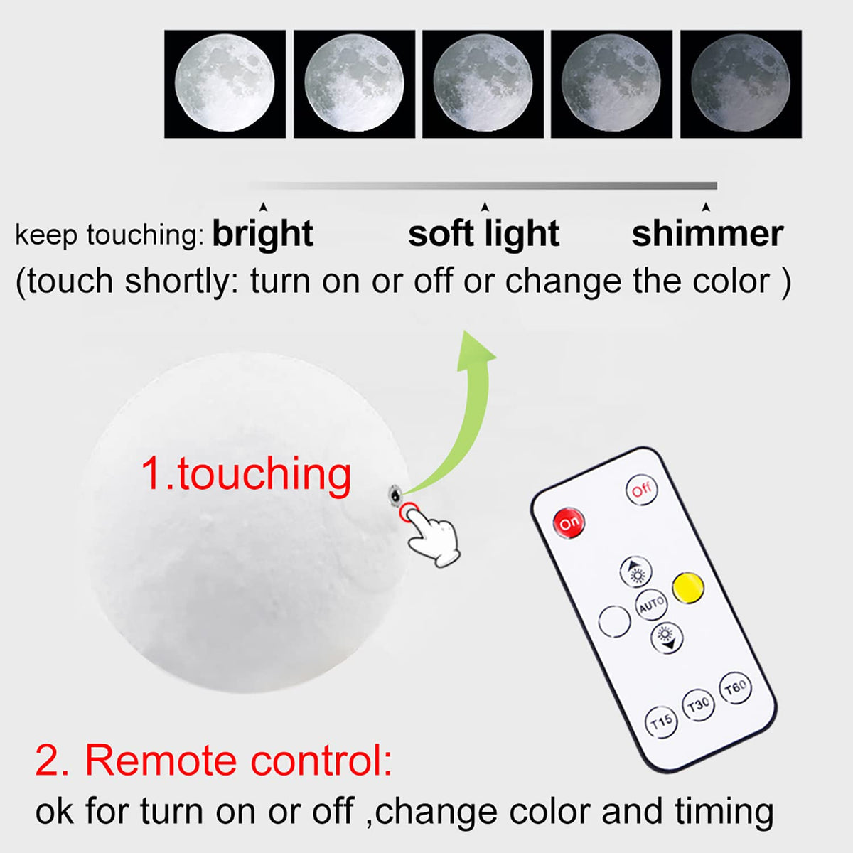 Q: How can I change the color and brightness of the moon lamp?A: You can easily change the color of the K KENON Moon Lamp by touching it. It offers two color options: white and yellow. Additionally, you can adjust the brightness by long-pressing to enable the dim function for a customized lighting experience.