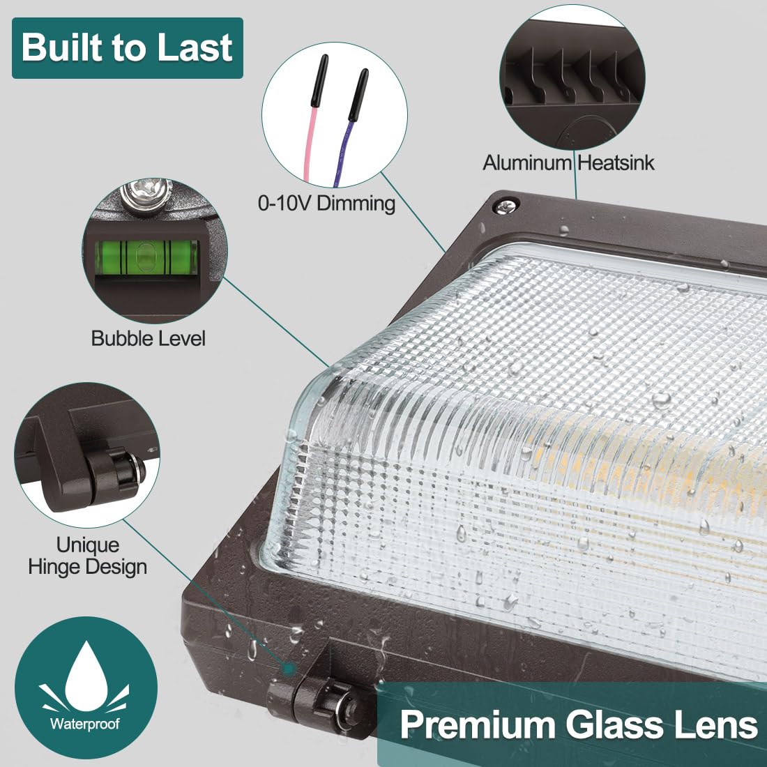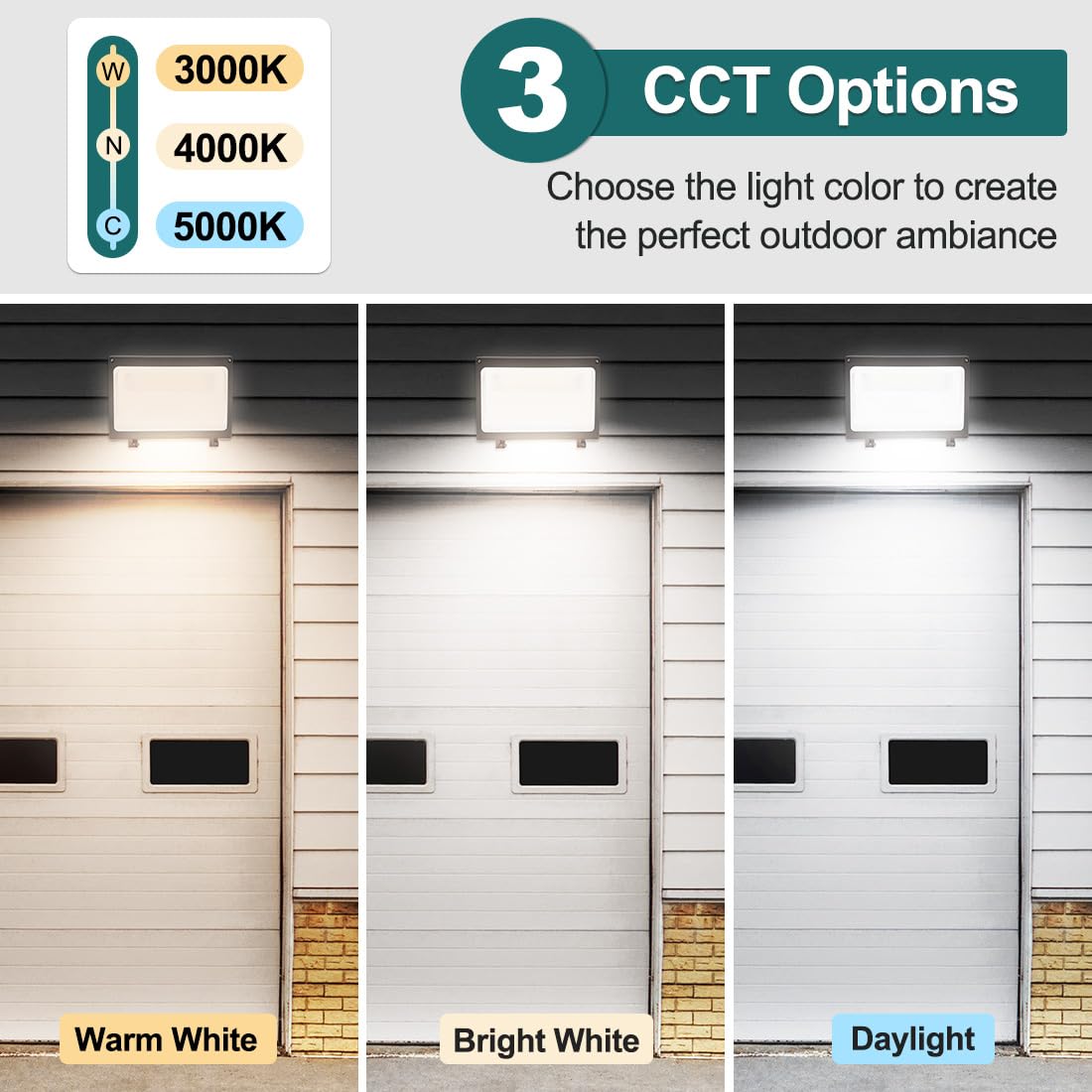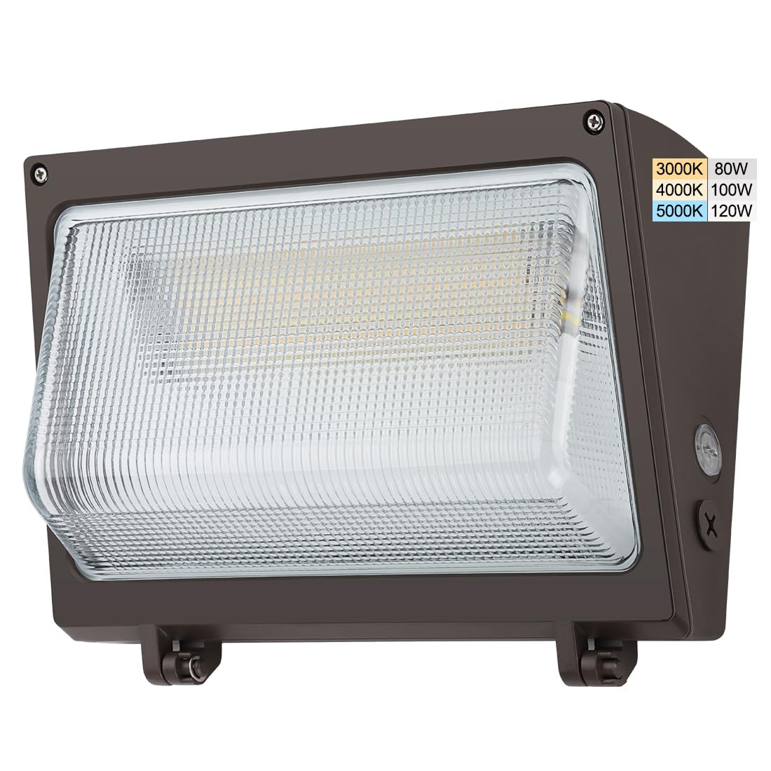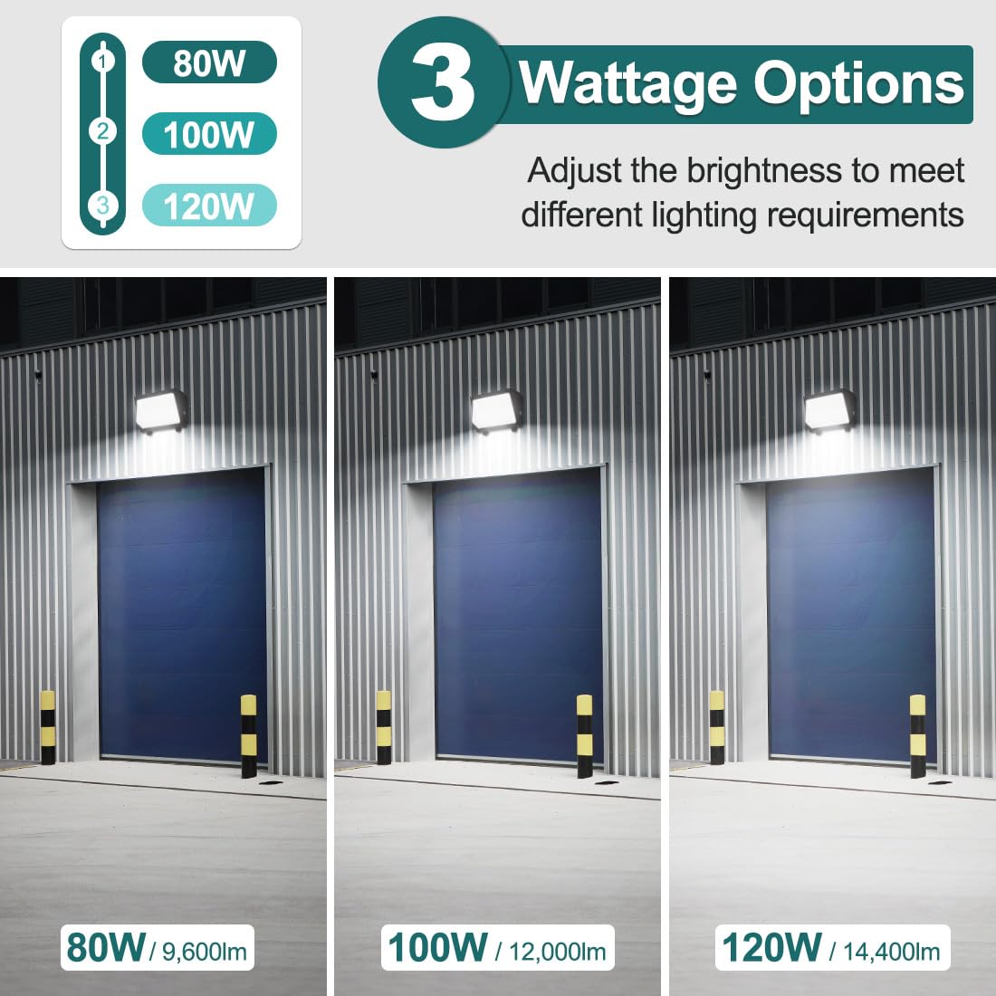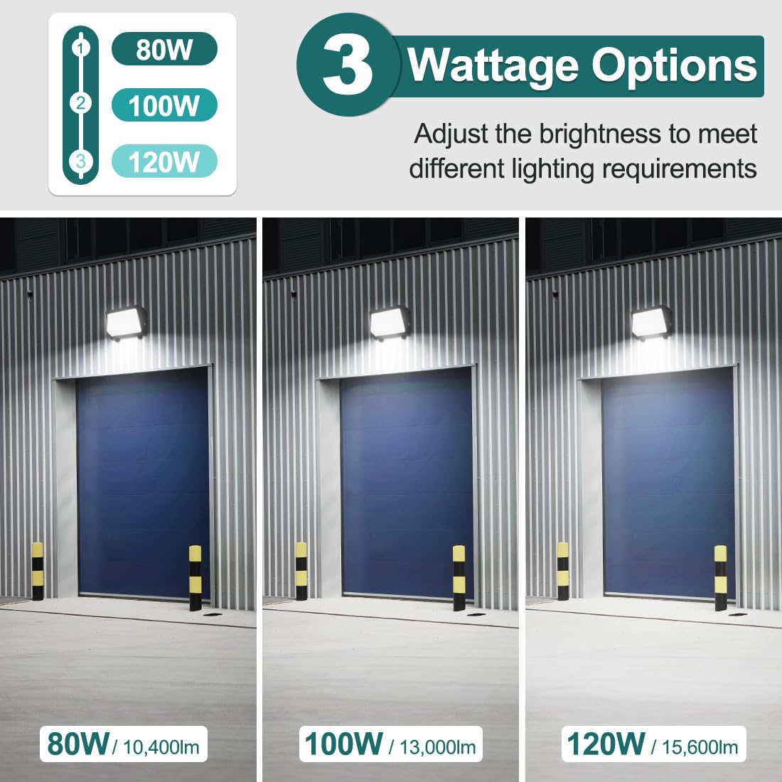 - **Adjustable Wattage and Color Temperature**: This wall pack light provides three selectable wattage options (120W, 100W, and 80W) and three color temperature settings (3000K Warm White, 4000K Bright White, and 5000K Cool White). With a maximum output of 15,600 lumens, you can customize the lighting to suit various applications, from warehouses to schools.