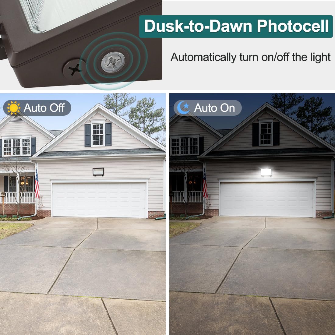 Q: How does the dusk-to-dawn photocell work on this wall pack light?A: The built-in dusk-to-dawn photocell automatically turns the Kadision Wall Pack light on at dusk and off at dawn, providing convenient and energy-efficient lighting without the need for manual control.