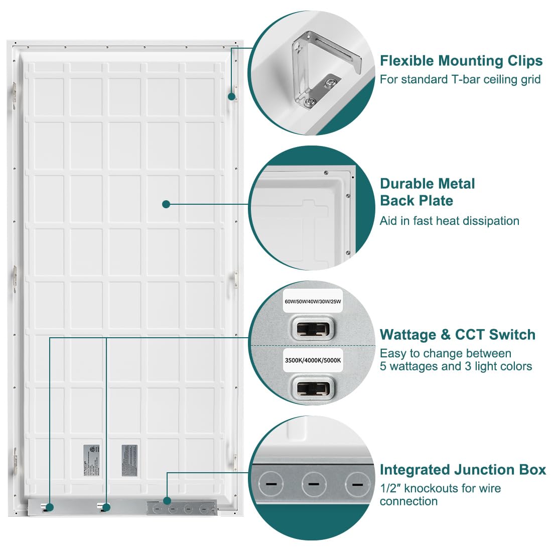 Q: What are the wattage options available for the kadision 2x4 LED Flat Panel Light?A: The kadision 2x4 LED Flat Panel Light offers five adjustable wattage options: 60W, 50W, 40W, 30W, and 25W. This feature allows you to select the ideal brightness level during installation based on your specific lighting needs.