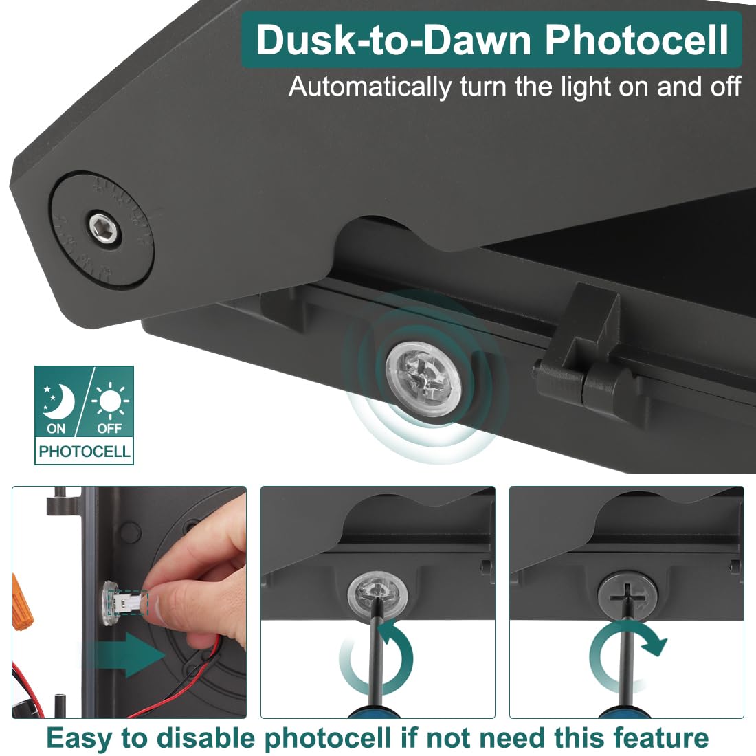 Q: How does the dusk-to-dawn photocell work?A: The built-in dusk-to-dawn photocell automatically turns the light on at dusk and off at dawn, ensuring that your outdoor areas are illuminated only when needed. For manual control, you can easily disconnect the photocell wire.