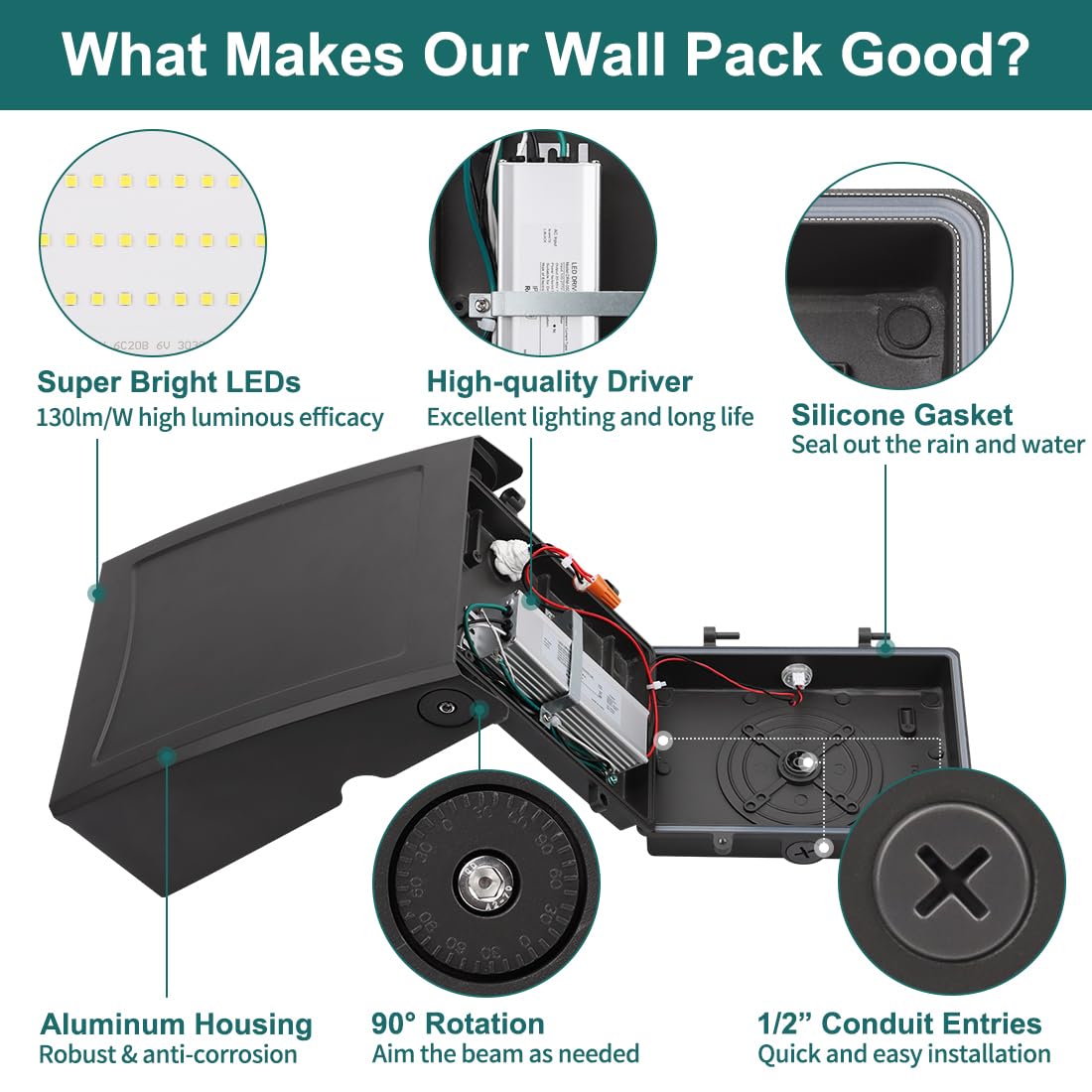 - **Dusk-to-Dawn Photocell**: Equipped with a built-in photocell, this wall pack automatically turns on at dusk and off at dawn, ensuring convenience and energy savings. For those who prefer manual control, simply unplug the photocell wire connector for switch operation.