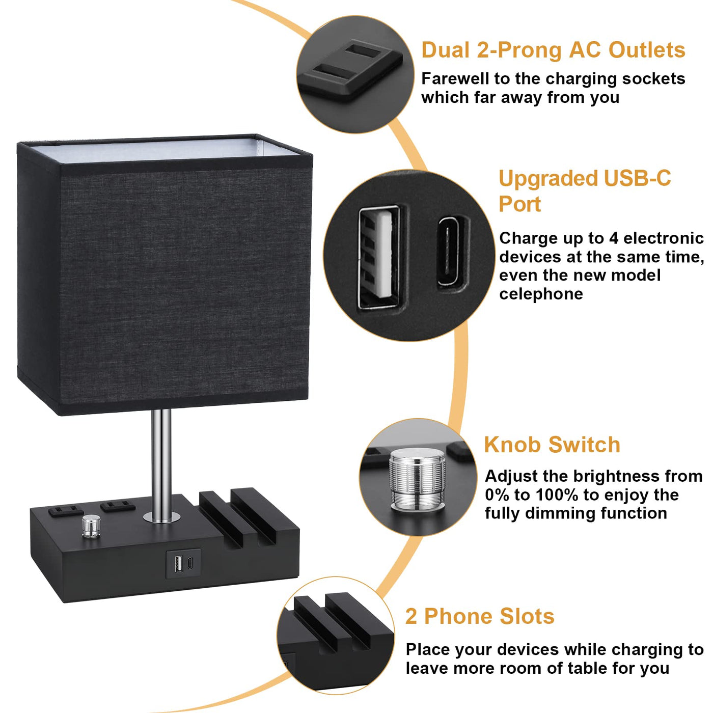 Kakanuo Table Lamp For Bedroom With Dual Usb Ports, Fully Dimmable Black Bedside Lamp With Phone Stands And 2 Charging Outlets,