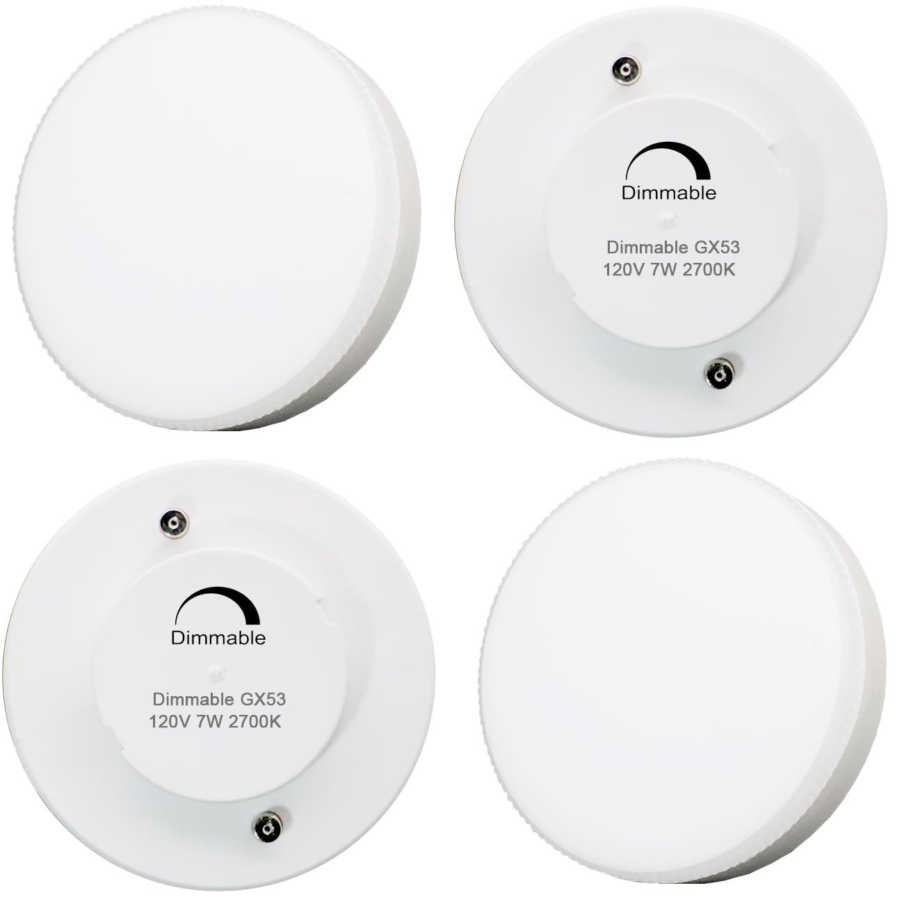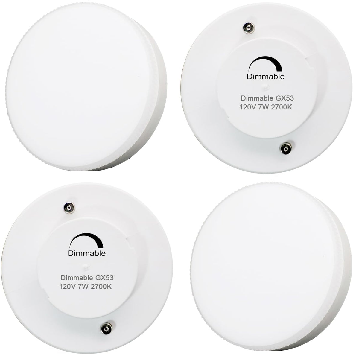 KAKEMONO Dimmable GX53 LED Bulb Specifications .Dimmable: Yes Material: Aluminum + plastic cover Color Temperature: Warm White 2700 Kelvin Voltage: AC 110-130 Volt Base Type: GX53 Wattage: 7 watts Lumen: 600Lm Incandescent Equivalent: 50W CRI: >85 Size: Diameter 2.91* Height 1.10 inch Application:Creating a cozy and warm white full glow ambient atmosphere, perfect for kitchens, living rooms, bedrooms and hallway. Perfect lighting source for under cabinet, showcase, exhibition, closet, ceiling lighting.Package Include: 4 x 7watts LED GX53 Dimmable Bulb 2700K Soft Warm White Lights 120 degree beam angle