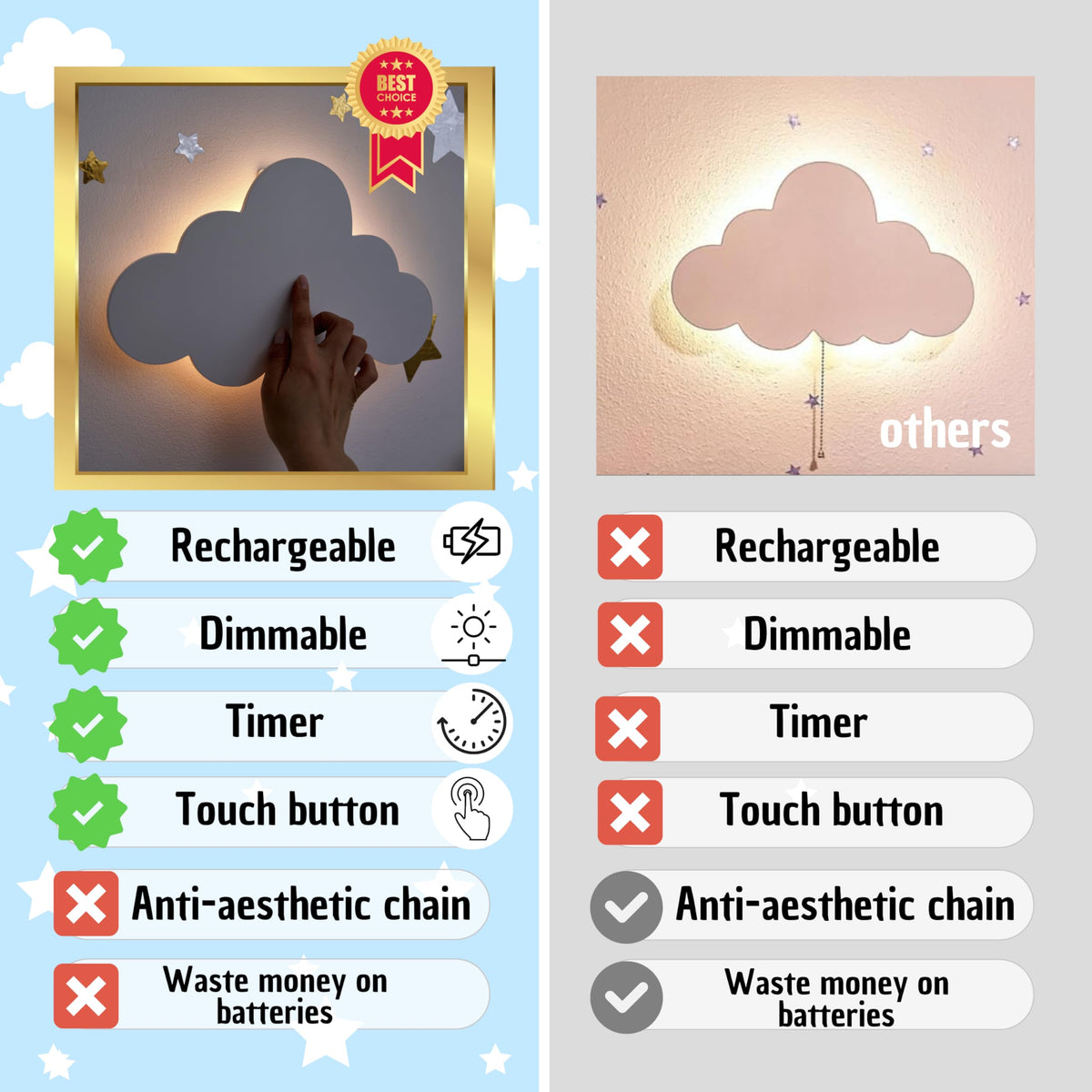 Description: Introducing KALEOLI Nursery Night Light: A Magical Addition to Your Child's Room Create a soothing and comforting atmosphere for your little ones with KALEOLI Nursery Night Light. The cloud-shaped LED backlit glow adds a touch of whimsy to any nursery or kids' room, making it a good night light for children of all ages. The cordless design ensures safety and versatility, allowing you to place it in a good spot to complement your child's favorite themes. Benefits: LED backlit with cloud board Cordless & Decorative Rechargeable Battery Dimmer with 3 Intensities 90min Timer to Turn Off