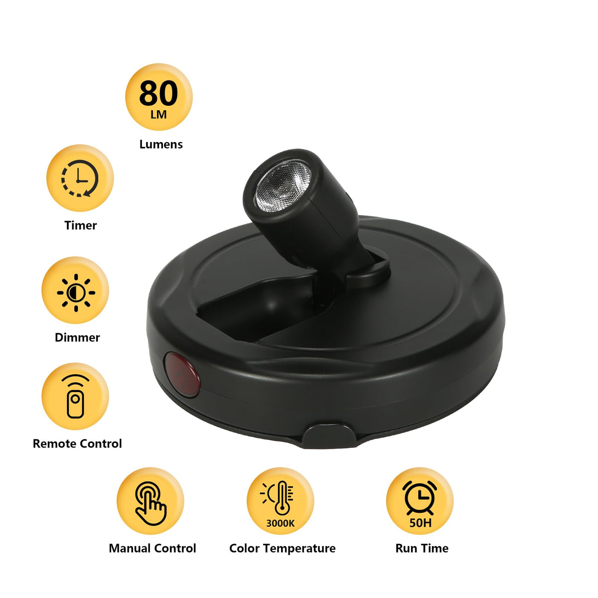 More Details * 80 Lumens, Long Lasting Led, Lifespan Is 80000 Hours,3000K Warm White Light, 0.6W, Dc 4.5V. * Set The Brightness To 50% Or 100% With The Dimmer Buttons Or Press The - Or + Buttons To Adjust The Exact Level Of Brightness From 10% - 100%. * There Is An Optional Timer That Will Automatically Turn The Touch Lights Off In 15, 30, 60 Or 120 Minutes. * The Remote Control Can Operate The Spotlight Within 18 Ft. * Push The Button Switch On The Shelf Lights Can Also Turn Them On/Off. * Simple To Install With Provided Hook And Loop Tapes Or Screws. * Powered By 3 Aa Batteries(Not Included), Battery Run Time Is 50 Hours For Full Brightness. * The Spotlight Can Be Used Anywhere Indoor To Light Up Your Closet, Bookcase, Painting, Picture, Skulpture, Artwork, Statue, Model, Portraits, Etc. Warm Tips When Mount With Hook And Loop Tapes, Please Press Firmly For 5 Seconds, And Make Sure The Surface Where You Stick The Light Is Clean And Smooth. Packing List - 2 X Spotlight - 2 X Remote Control - 2 X Hook And Loop Tape - 4 X Screw - 1 X User Manual