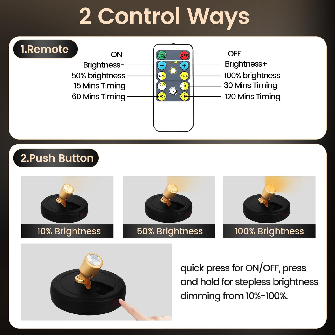 More Details * 100 Lumens, long lasting LED, lifespan is 80000 Hours, 3000K warm white light, 1W. * Set the brightness by pressing the - or + buttons from 10% - 100%. * Timer setting will automatically turn the spot lights off in 15, 30, 60 or 120 minutes. * The remote control can operate the spotlight within 100 ft. * Push the button switch on the picture lights can also turn them ON/OFF. * Simple to install with provided metal plate and magnet. * The spotlight can be used anywhere indoor to light up your closet, bookcase, painting, picture, skulpture, artwork, statue, model, portraits, plants, trees, etc. Packing List - 2 x Spotlight - 2 x Remote Control - 2 x Metal Plate - 2 x Charging Cable - 1 x User Manual