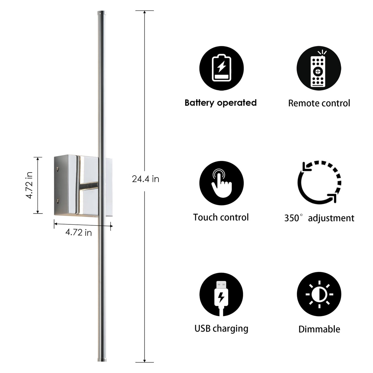 About Us KARTOOSH is the hard work of 3 generations of furniture manufacturers. With over 30 years of experience in the field, KARTOOSH is now retailing to consumers directly. Aim to provide the best quality-assuring, best service assuring and best product to you. This battery operated wall sconce adds extra lighting and gorgeous colors to your home. They are made of gold faced metal and are equipped with square wall boxes. They look great in modern or classic spaces. This wall lamp diffuses the light from 5W light bars to the entire living room, bedroom,entryway. Color: Chrome Material: Metal Style:Modern Power Source:Battery Powered Controller Type:Remote Control Wattage:5W Mounting Type:Wall Mount Color Temperature:3000K Product Dimensions:24.4inch L ? 4.72inch W x 3.5inch H Light Direction:Adjustable Special Feature:350?rotate, Dimmable,Rechargeable