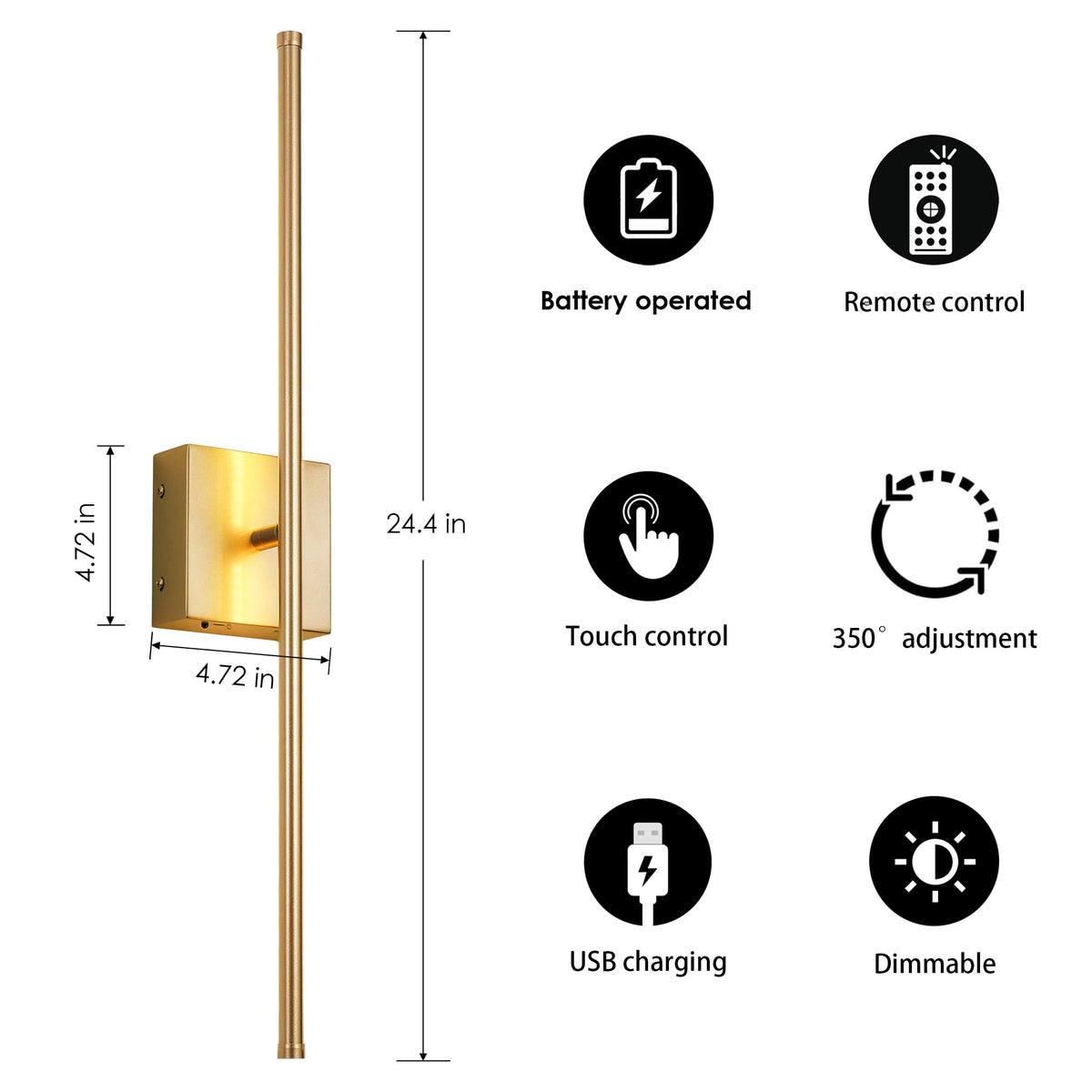 About Us KARTOOSH is the hard work of 3 generations of furniture manufacturers. With over 30 years of experience in the field, KARTOOSH is now retailing to consumers directly. Aim to provide the best quality-assuring, best service assuring and best product to you This battery operated wall sconce adds extra lighting and gorgeous colors to your home. They are made of gold faced metal and are equipped with square wall boxes. They look great in modern or classic spaces. This wall lamp diffuses the light from 5W light bars to the entire living room, bedroom,entryway Color:Gold Material: Iron,Aluminium Style:Moderm Power Source:Battery Powered Controller Type:Remote Control Wattage:5W Mounting Type:Wall Mount Color Temperature:3000K Product Dimensions:24.4inch L ? 4.72inch W x 3.5inch H Light Direction:Adjustable Special Feature:350?rotate, Dimmable,Rechargeable