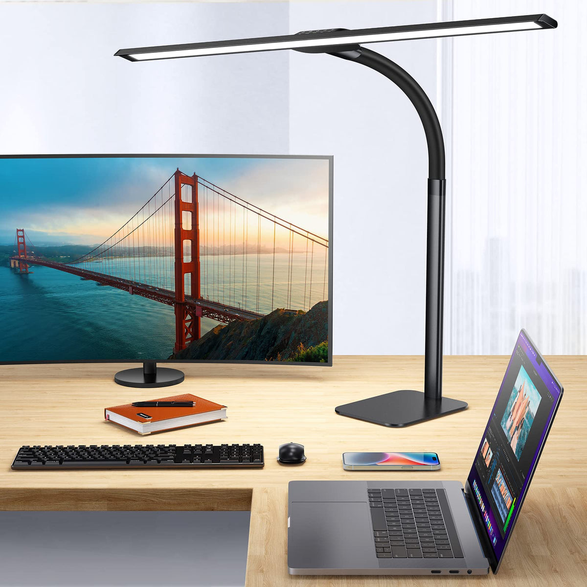 Q: What are the main features of the Kary LED Desk Lamp?A: The Kary LED Desk Lamp features a sleek design with a 31.5-inch wide light bar, providing super bright 1800 lumens lighting without glare or flicker. It offers auto-dimming capabilities, five adjustable color temperature modes, and a flexible silicone gooseneck for multi-angle adjustments.