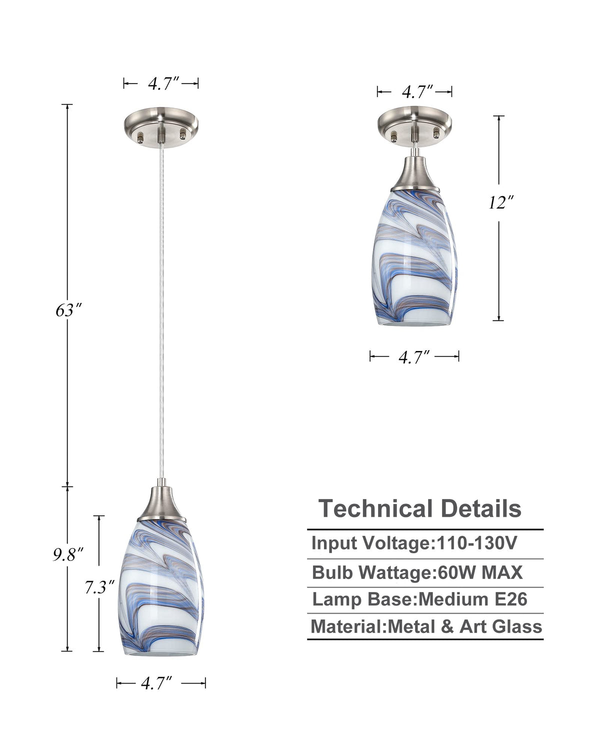 Glass Pendant Light,Hand-Crafted Art Glass Mini Pendant Hanging Lights Fixtures With Brushed Nickel Finished Ceiling Hanging Lamp Adjustable Cord For Kitchen Island,Bed Room,Hallway,Dining Room