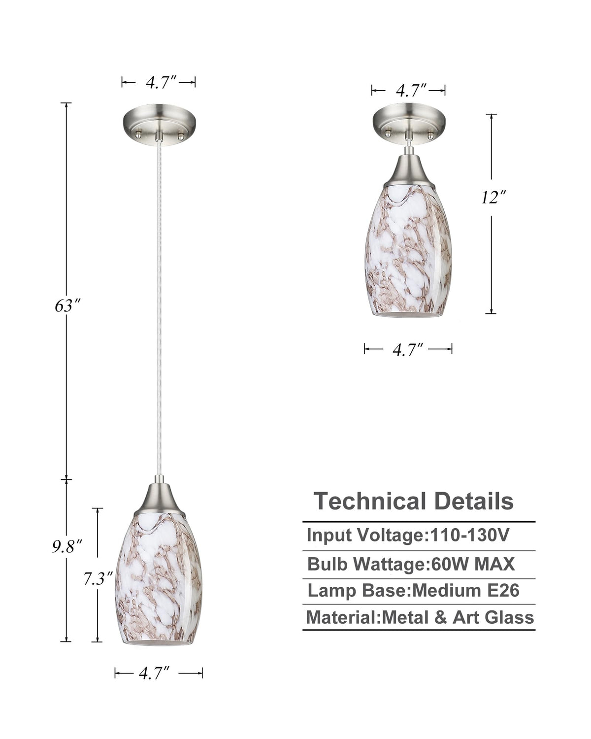 Glass Pendant Light,Hand-Crafted Art Glass Mini Pendant Hanging Lights Fixtures With Brushed Nickel Finished Ceiling Hanging Lamp Adjustable Cord For Kitchen Island,Bed Room,Hallway,Dining Room