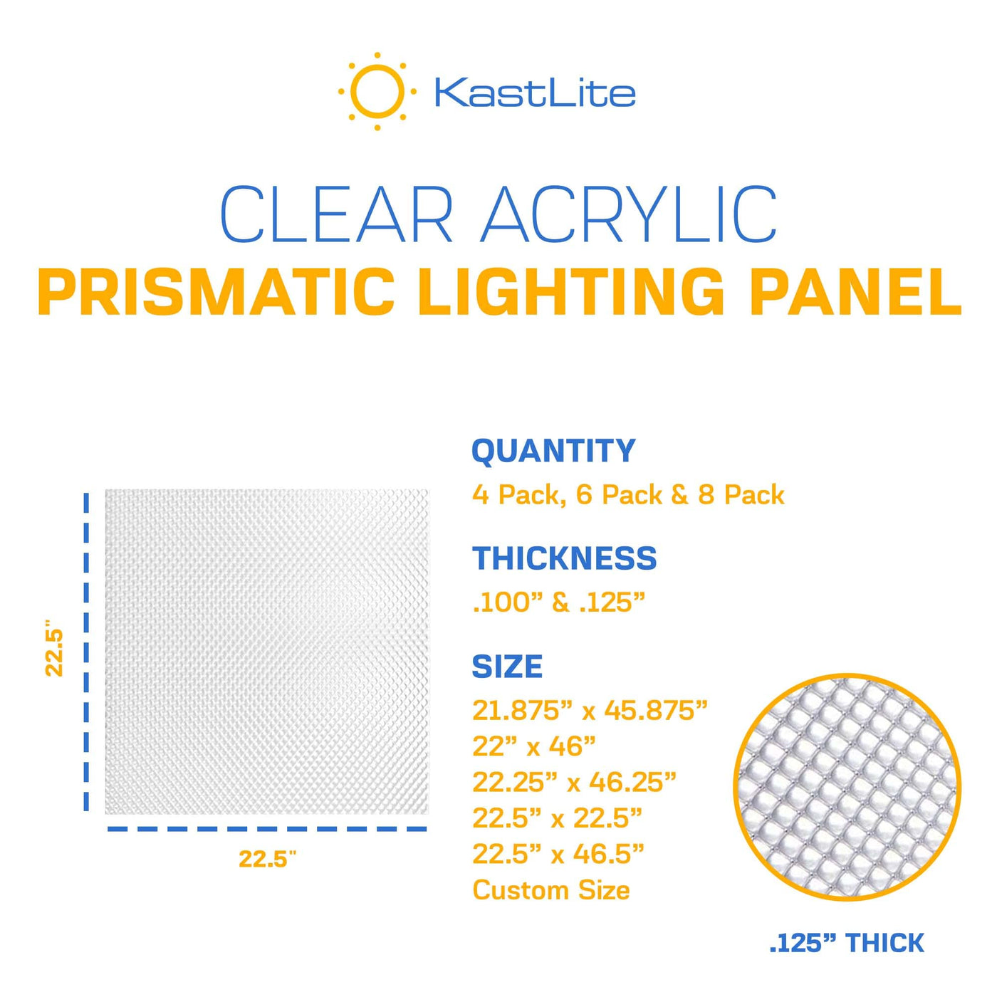 From Workspaces To Home Spaces - Kastlite Covers It All. Upgrade Your Space With Kastlites Prismatic Light Shades For Ceiling Lights, Designed To Deliver Superior Clarity, Performance, And Style. Made From Heavy Duty Plastic, These Clear Acrylic Panels Offer A Sleek, Professional Finish That Enhances Brightness While Reducing Glare. Ideal For Both Residential And Commercial Applications, These Ceiling Light Covers Are Engineered To Fit Standard Drop Ceilings And Are Available In Multiple Sizes - Including Custom Options. Whether You'Re Replacing Light Covers For Ceiling Lights In Your Home Or Need Reliable Office Light Covers For A Professional Setting, Kastlite Delivers A Durable, High-Transmission Solution That Wont Yellow Or Warp Over Time. Built For Performance In Any Overhead Light Fixture, This Panel Combines Effortless Installation With Long-Lasting Quality. Product Higlights: Non-Yellowing Acrylic - Stays Clear Over Time Shatter-Resistant - Safe And Durable Embossed Prismatic Texture - Spreads Light Evenly No Visible Bulbs - Hides Lamp Images Completely High Light Transmission - No Loss In Brightness Heavy-Duty Thickness - 0.125 For Extra Strength Scratch-Resistant Surface - Keeps A Clean Look Fits Standard Drop Ceilings - No Special Tools Needed Lightweight Build - Easy To Lift And Handle Strong Impact Resistance - Less Breakage Risk Custom Sizing Available - Fits Many Applications
