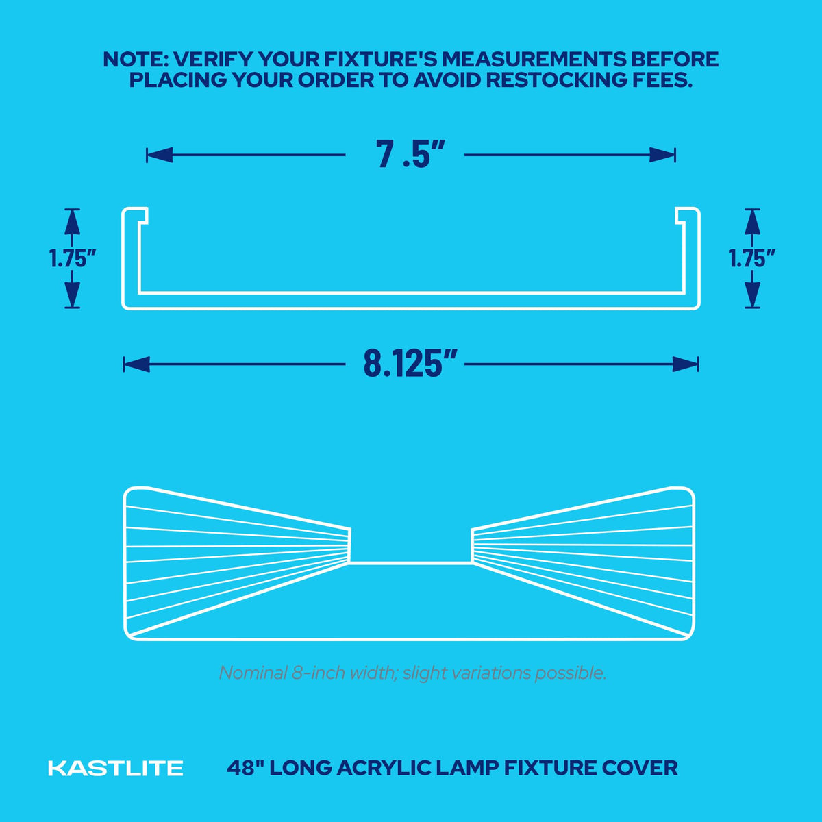 Upgrade your lighting setup with the KastLite DSB48 48 inch Two Bulb Replacement Wraparound Lens. Perfect for your home, office, or classroom, this fluorescent light diffuser wrap around lens is designed for seamless installation and superior performance. Made from prismatic acrylic, it ensures bright and even light distribution, making it an ideal choice for fluorescent light covers for ceiling lights. Whether you need a reliable classroom lamp or a durable fluorescent light diffuser 48 inch, this original manufacturer replacement guarantees a perfect fit and effortless maintenance. HIGHLIGHTS: - Clear acrylic material - Measurements: 4 ft length, 2 in height, 8 in width - Snap-on fluorescent light cover for tool-free assembly - Designed for 2-lamp fixtures - For use with nominal 8'' wide 2 lamp wrap around fixtures - Compatible with Lithonia Lighting SB Series and fixtures 324925, 324930 - Original manufacturer replacement for perfect fit - Seamless and sturdy design - Continuous diffuser support - UL and cULus listed - Enhances light distribution with a flat-bottom diffuser - Texture: Prismatic Enhance your lighting today with the KastLite DSB48 2-Bulb 48 inch Fluorescent Light Fixture Cover. Perfect for light covers for ceiling lights in classrooms, garages, home & offices, our 4ft fluorescent light fixtures covers provide outstanding performance and easy maintenance. Upgrade your kitchen ceiling light or classroom lighting with this durable light diffuser panel. Dont wait; transform your space with KastLite's high-performance lighting solutions now!