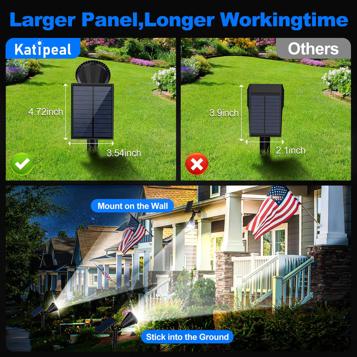Q: How do I install the Katipeal Solar Spot Lights?A: Installation of the Katipeal Solar Spot Lights is simple and flexible. You can either stake them into the ground using the provided ground stakes for a landscape spotlight effect or mount them on a wall using the included screws. This makes it easy to place the lights in your yard, garden, or along pathways.