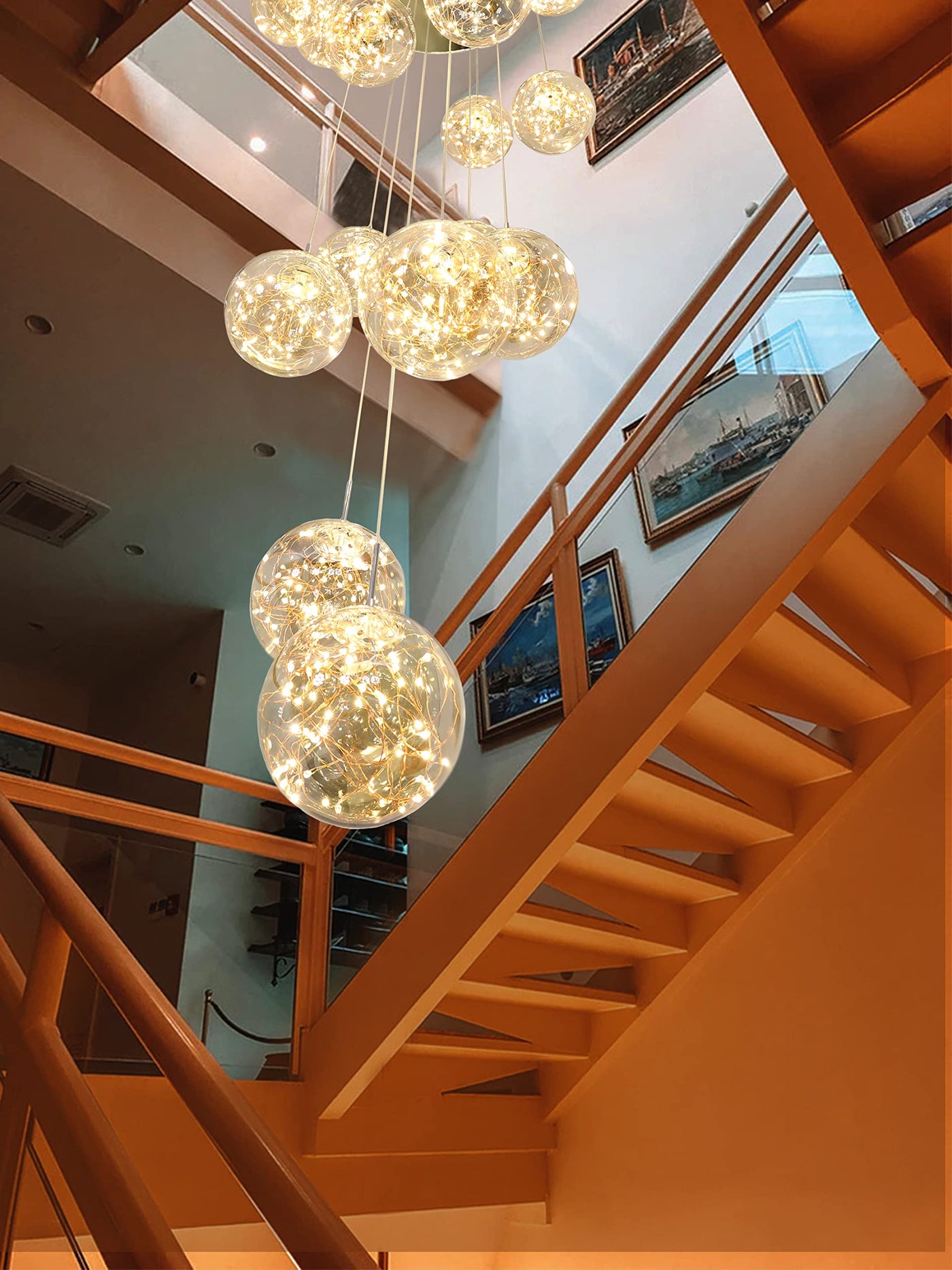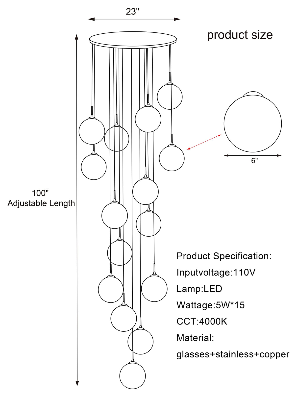Q: What materials are used in the construction of this chandelier?A: This chandelier features a round stainless steel lampholder that is polished for durability and anti-oxidation, along with a spherical glass lampshade that houses the energy-saving LED copper wire light source.